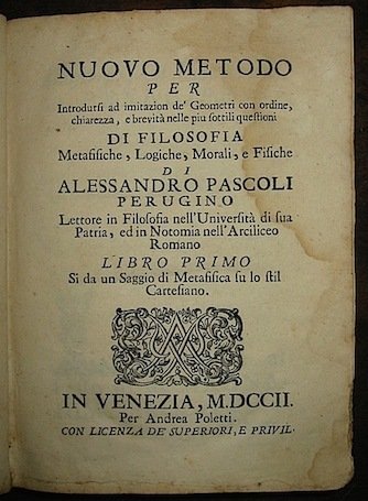Nuovo metodo per introdursi. nelle più sottili questioni di filosofia metafisiche, logiche, morali, e fisiche.