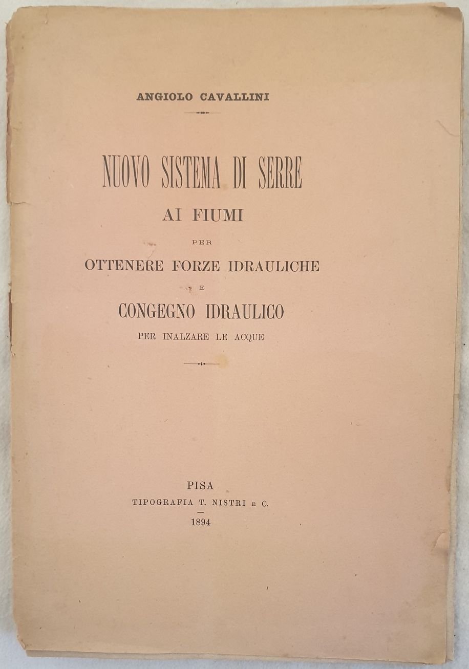 Interessante pubblicazione del 1893 di idraulica di Angiolo Cavallini. L'autore descrive un sistema per inanlzare le acque dei fiumi. Tre tavole rripiegate in fine che mostrano congegni. In discrete condizioni. Copertina editoriale in discrete condizioni con lievi usure marginali. Legatura in buone condizioni ma corpo del libro staccato dalla copertina. All'interno le pagine si presentano in buone condizioni con fioriture. In 8. Dim. 24x16,5 cm. Pp. 16. Interesting pamphlet of 1893 of hydraulics by Angiolo Cavallini. The author describes a systeem to arise waters of rivers. Three folded plates in the end showing tools. In fair conditions. Editorial cover in fair conditions lightly worn in the extremities. Binding in good conditions but the body of the book detacehd from the cover. Inside pages are in good conditions with foxing. In 8. Dim. 24x16,5 cm. Pp. 16