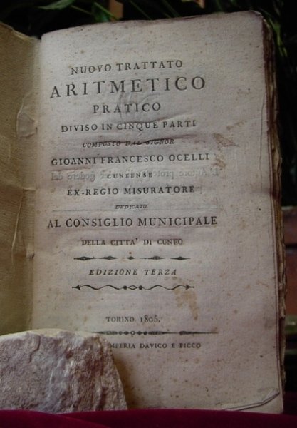 Volume in 8 piccolo (cm. 17 x 11), brossura originale in cartoncino azzurrognolo, frontespizio, carta di privilegio con firma autografa dell'autore, dedicatoria al consiglio municipale della citt di Cuneo in prefazione, 288 pp., numerosissimi finalini ornamentali incisi in rame. Importante repertorio di aritmetica, in questa terza edizione aumentato di un intero ampio capitolo riguardante i cambi ufficiali delle monete correnti in Europa ed il rapporto di valore fra le stesse. Sono inoltre riportati i valori delle varie misure lineari e di peso dei vari Stati che avevano commercio con la Francia nonch un saggio sull' arbitraggio e dei 'conti a Tirone'. In ottimo stato, carta greve e frusciante, in barbe, di difficile reperibilit.