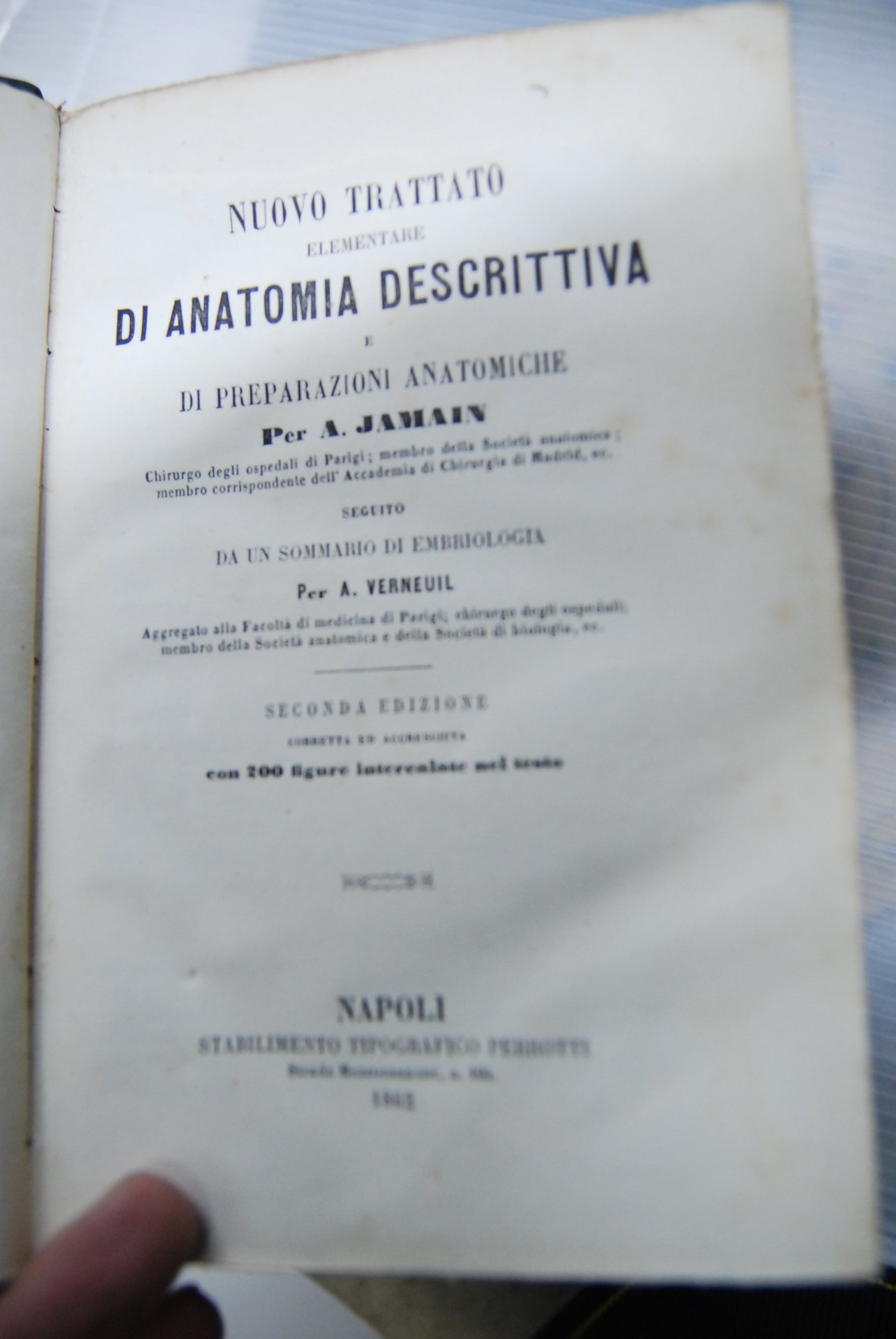 Alexandre Jamain Nuovo trattato Elementare di Anatomia Descrittiva e di Preparazioni Anatomiche. Seguito da un sommario di embriologia per a. verneuil. Napoli 1862 Ottime Rilegato .