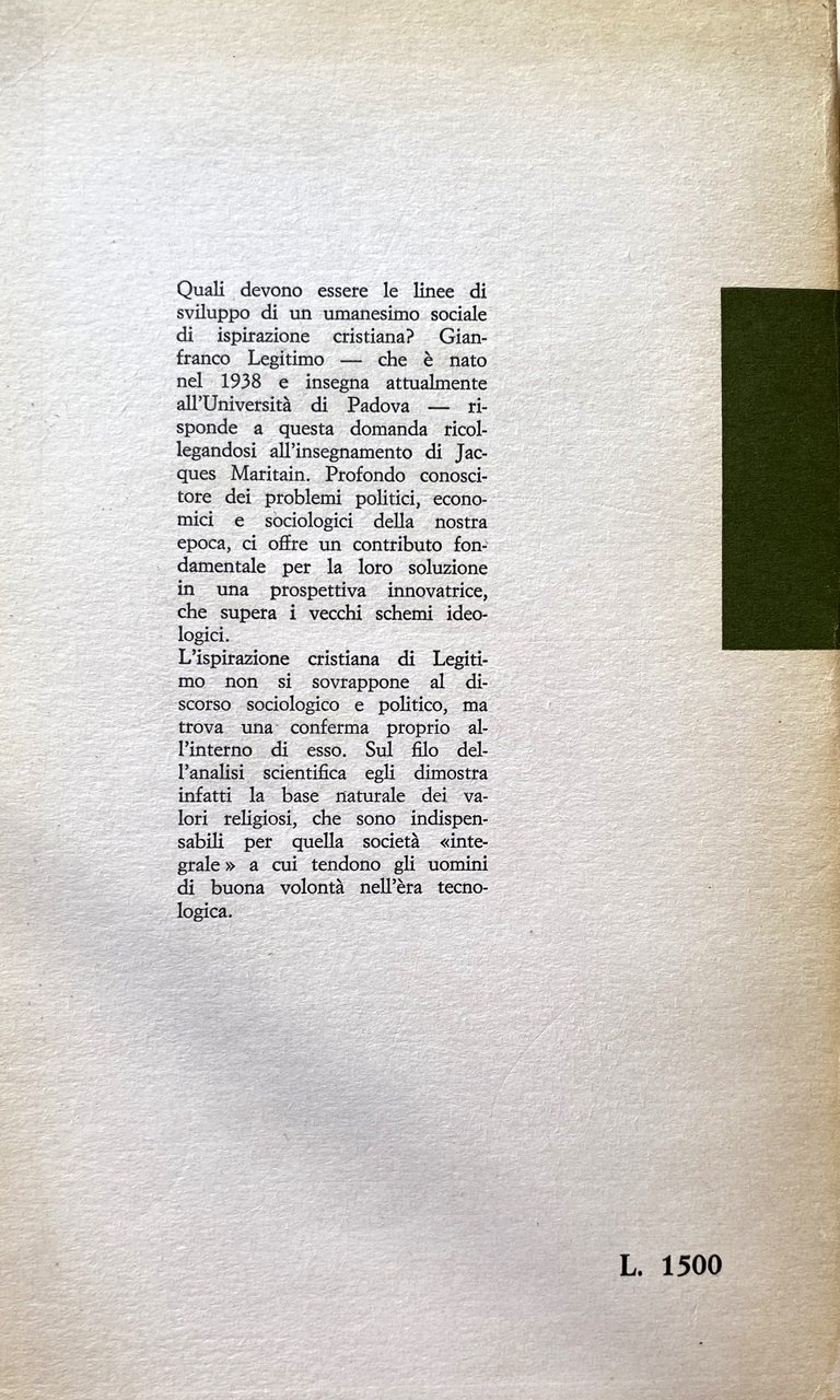 Quali devono essere le linee di sviluppo di un umanesimo sociale di ispirazione cristiana? Gianfranco Legitimo che è nato nel 1938 e insegna attualmente all'Università di Padova risponde a questa domanda ricollegandosi all'insegnamento di Jacques Maritain. Profondo conoscitore dei problemi politici, economici e sociologici della nostra epoca, ci offre un contributo fondamentale per la loro soluzione in una prospettiva innovatrice, che supera i vecchi schemi ideologici. L'ispirazione cristiana di Legitimo non si sovrappone al discorso sociologico e politico, ma trova una conferma proprio all'interno di esso. Sul filo dell'analisi scientifica egli dimostra infatti la base naturale dei valori religiosi, che sono indispensabili per quella società integrale a cui tendono gli uomini di buona volontà nell'èra tecnologica.