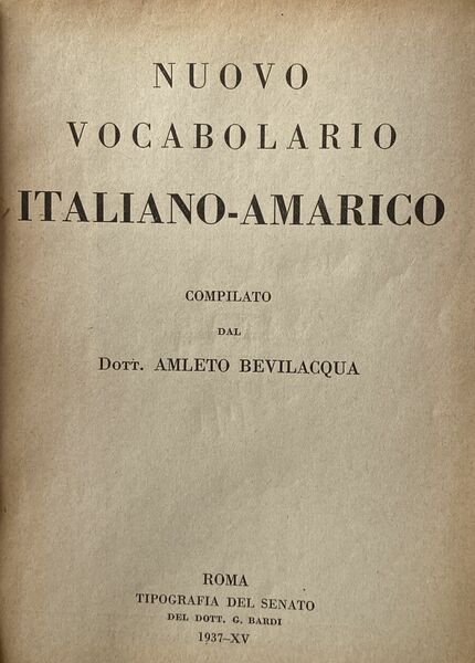 In-16, pp. VIII, (4) con tavola dell'alfabeto amarico con pronunzia figurata, 306, testo su due colonne. Legatura in tela edit., titolo in nero al dorso e al piatto anteriore.Buon esemplare.