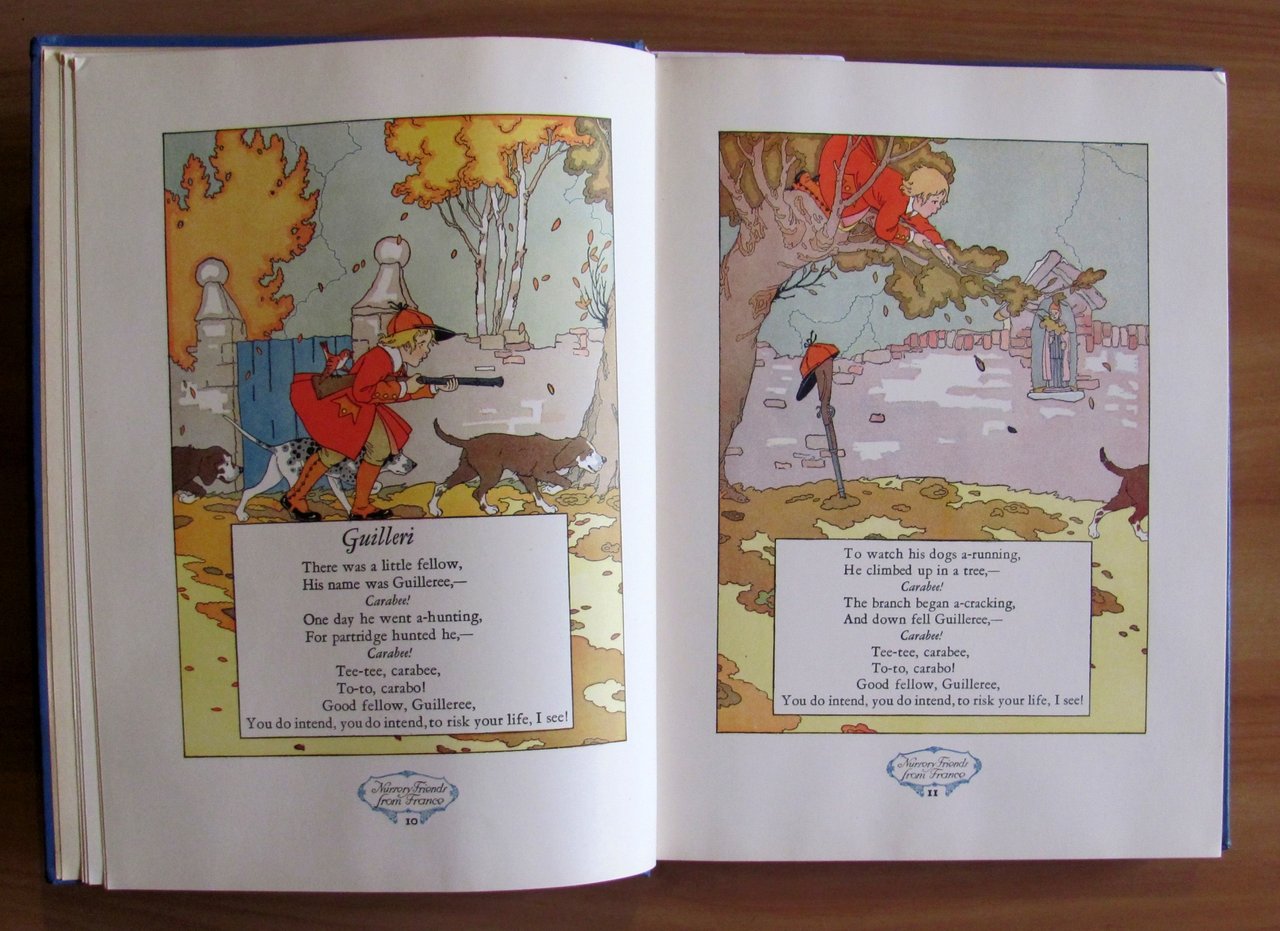 Belle illustrazioni a colori, in tutte le pagine, che accompagnano deliziosamente filastrocche e canzoncine, corredate da spartiti musicali, di Maud and Miska Petersham. Publ. The Book House for Children - Chicago, 1927. Tela editoriale con illustrazione a colori alla copertina e titoli in oro al piatto e al dorso. Esemplare freschissimo. 21x28,5; pp.191. Raro e in Stato di Nuovo. , Ottimo (Fine)