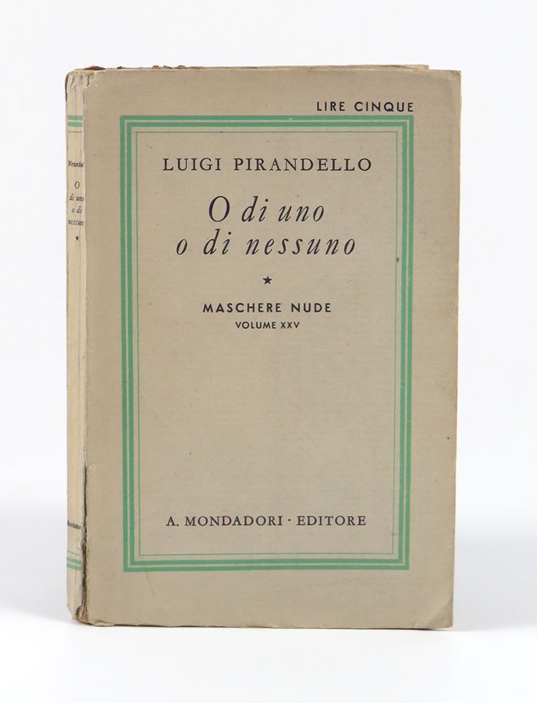 LIBROSeconda edizione autonoma.Più che buon esemplare.Prima edizione autonoma Mondadori del venticinquesimo «Maschere nude», originariamente pubblicato dal Bemporad nel 1929 (peraltro ultimo volume pirandelliano pubblicato dall’editore fiorentino). Mondadori subentra nella gestione editoriale dell’opera di Pirandello con «Maschere nude» 26 (Lazzaro) nel 1930, ripubblicando contestualmente i titoli già usciti da Bemporad, quasi sempre senza indicazione di data se non il «copyright» lasciato alla data dell’edizione originale (1929 in questo caso). La grafica di copertina di questa edizione fa propendere per una datazione almeno ai tardi anni ’30, mentre la menzione di «Giustino Roncella nato Boggiolo» (edizione rivista del romanzo «Suo marito» del 1911) nel catalogo editoriale ai risvolti fissa come ‘terminus post quem’ l’anno 1941.