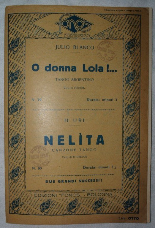 In 8. cm 27x18. Pp. 22. Partitura completa per orchestra del 1933 di due canzoni. Caratteristica copertina decorata dell'epoca. Ex libris sulla copertina ed in alcune pagine. Ottime condizioni. A complete score for orchestra of 1933. Carachteristic decorated cover of that period. Ex libris in the cover and in some pages. Very good conditions.