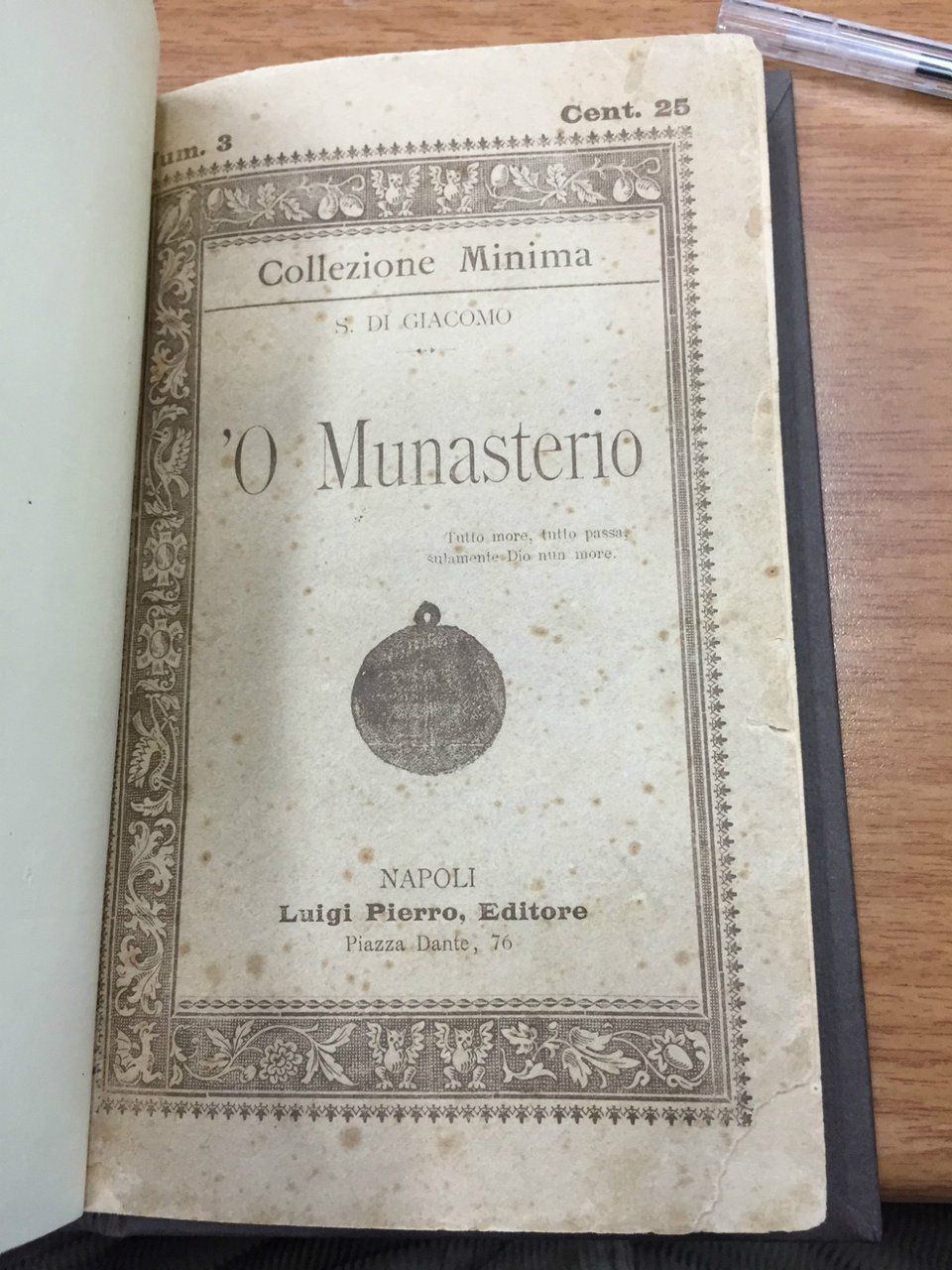 Napoli. Pierro 1891, 16°, pp. 64. Leg. Cart. Moderno, tassello. Conserva le copertine originali. Bruniture. Piccola mancanza alla copertina anteriore. Exlibris. N. 3 della collana. Ex libris. Raro.