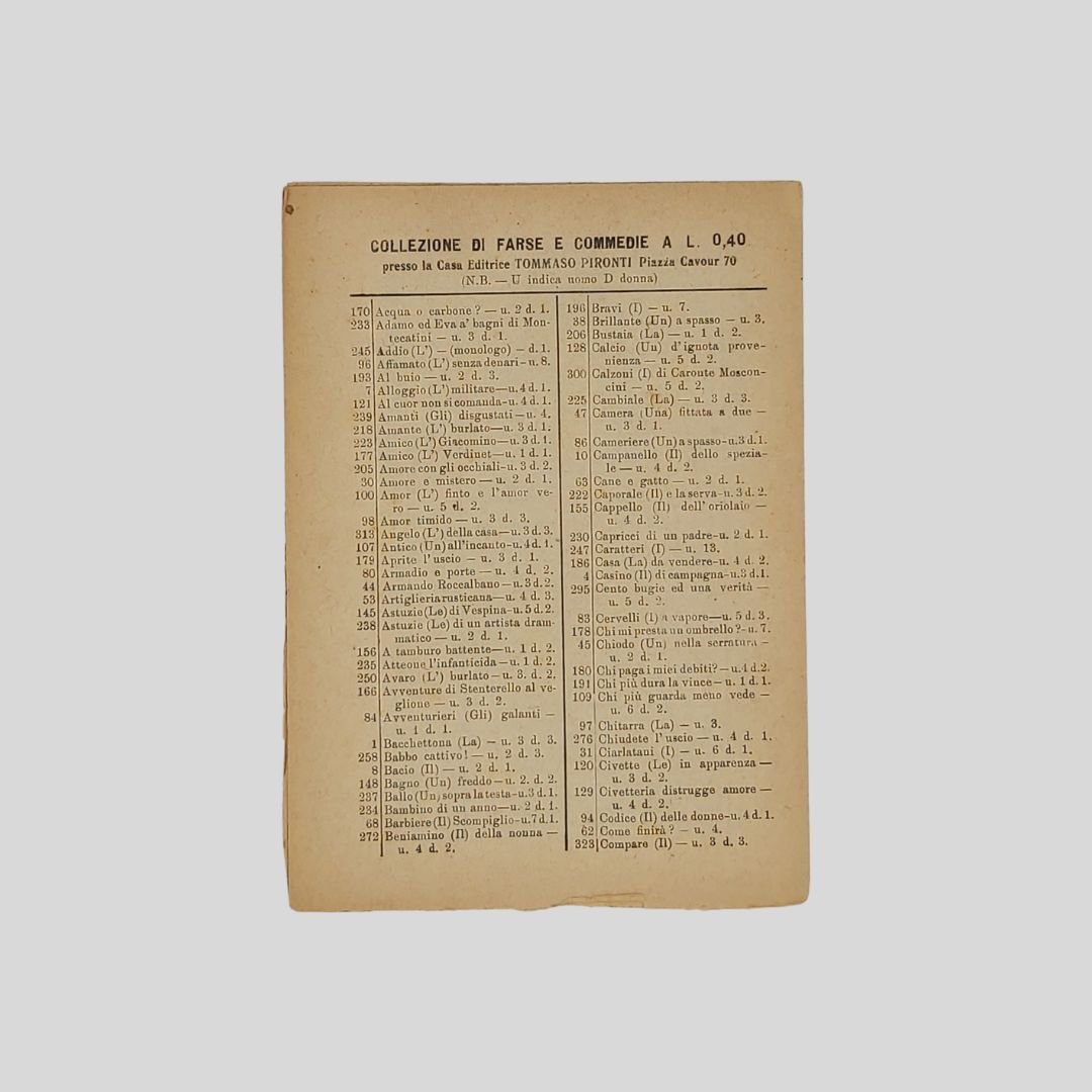 in-16 (cm 19), pp. 16-1 (cat. teatrale). Sedicesimo ripiegato e intonso.