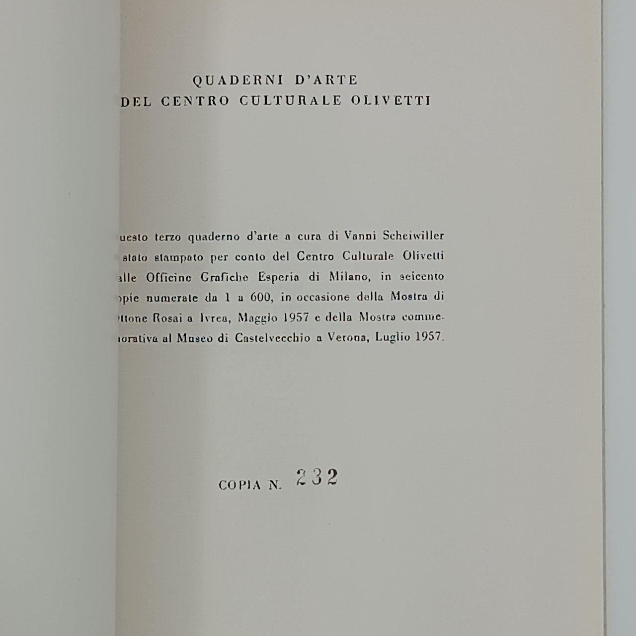 PRIMA EDIZIONE. Volume stampato in 600 copie numerate in occasione della mostra di Rosai ad Ivrea nel maggio 1957 (stesso mese della morte dell'artista). Questa è la copia n. 232. Lievi segni d'ususra sul lato superiore della sovracopertina. Ottima copia.