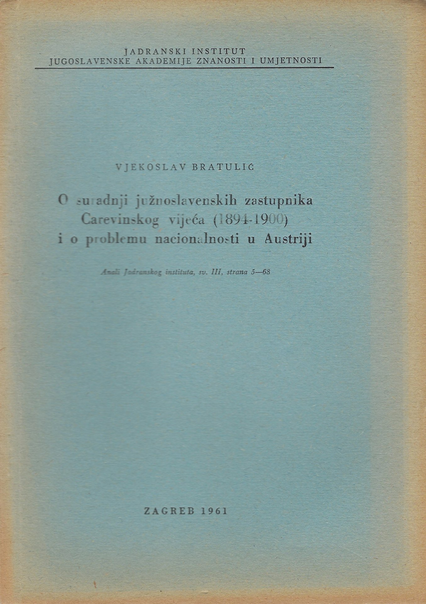 O Suradnji juznoslavenskih zastupnika Carevinskog vijeca (1894-1900 ) i o problemu nacionalnosti u Austriji