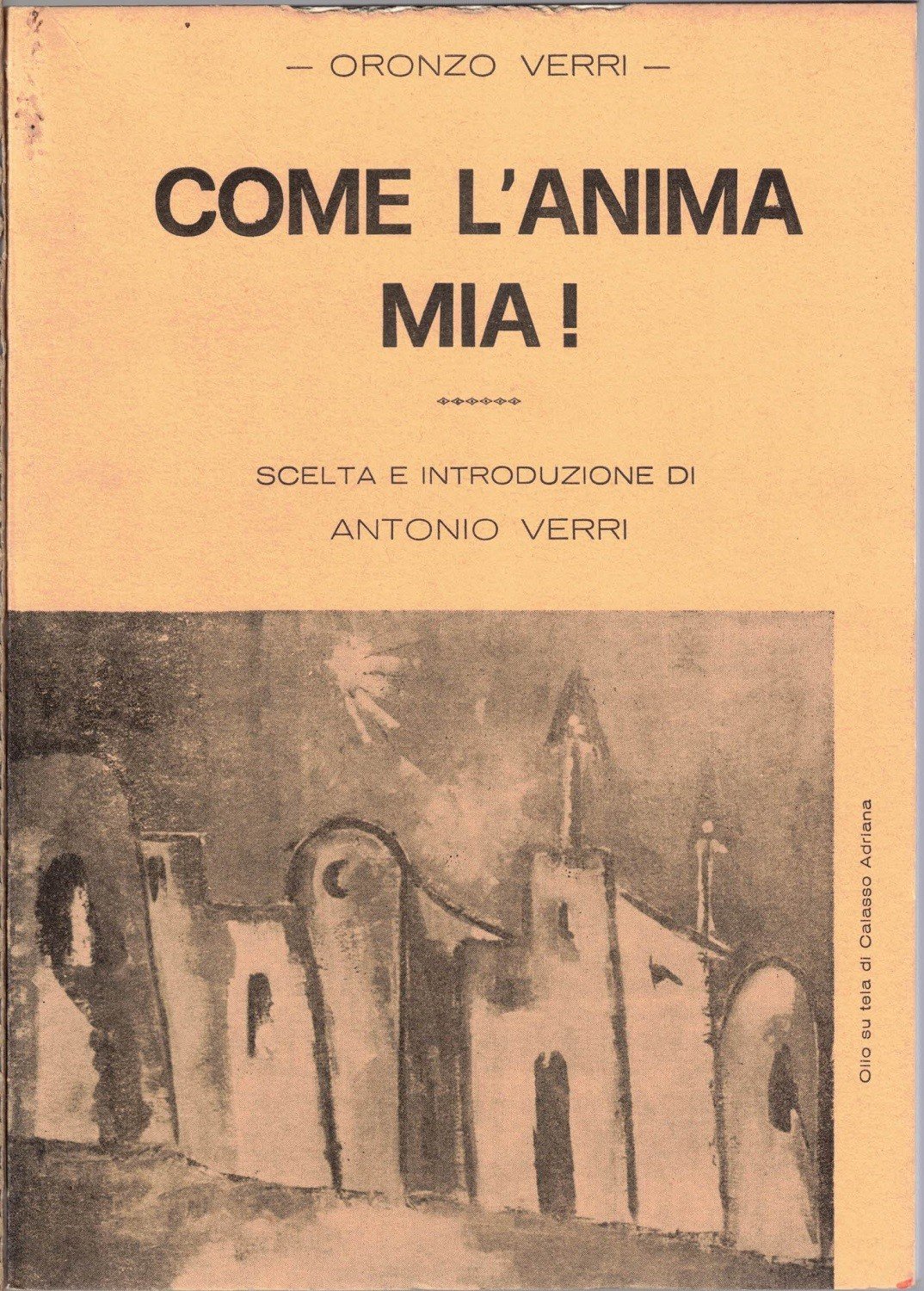 Oronzo Verri, Come l’anima mia!, scelta e introduzione di Antonio Verri, s.n., s.l. (ma stampato a Calimera, presso la Tipografia Castrignanò) s.d., pp. 45, cm 20, br. ed. Leggere tracce d’uso alla brossura, una minima mancanza al margine superiore della copertina anteriore e delle prime tre carte, per il resto esemplare ben conservato, con interno pulito e ben tenuto.