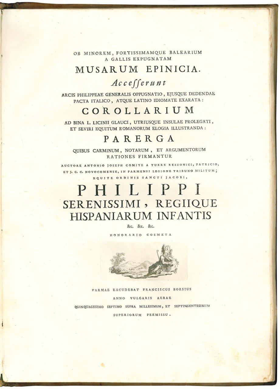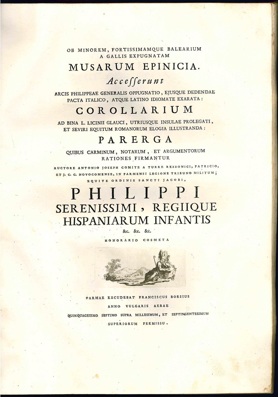 Ob minorem, fortissimamque Balearium a Gallis expugnatam Musarum epinicia. Accesserunt arcis Philippeae generalis oppugnatio, ejusque dedendae pacta italico, atque Latino idiomatae exarata: corollarium ad bina L. Licinii Glauci, utriusque insulae prolegati, et seviri equitum Romanorum elogia illustranda: Parerga quibus carminum, notarum, et argumentorum rationes firmantur auctore Antonio Joseph comite a Turre Rezzonici