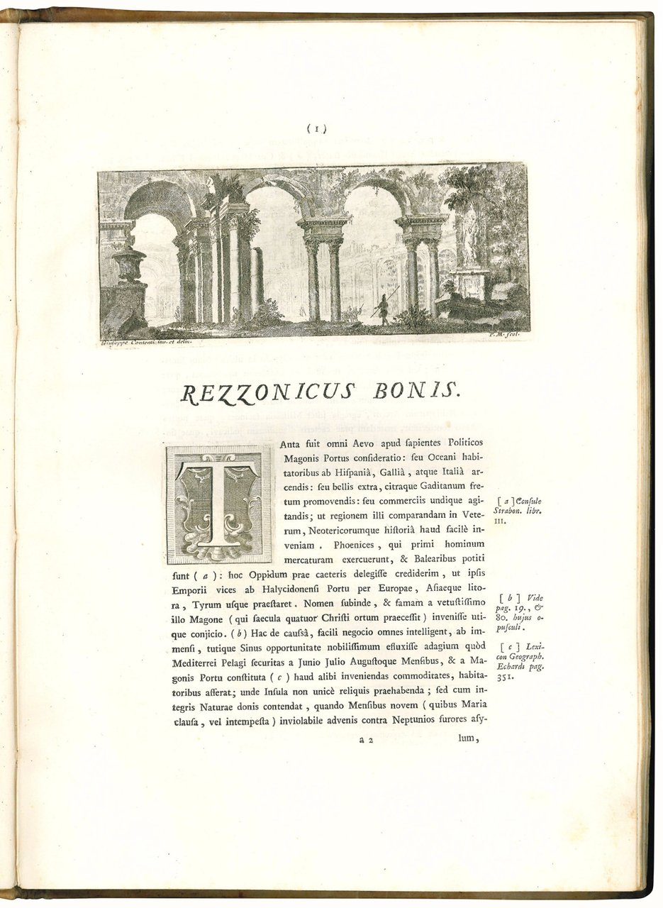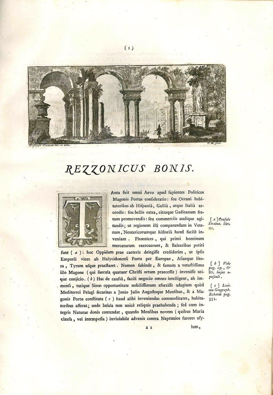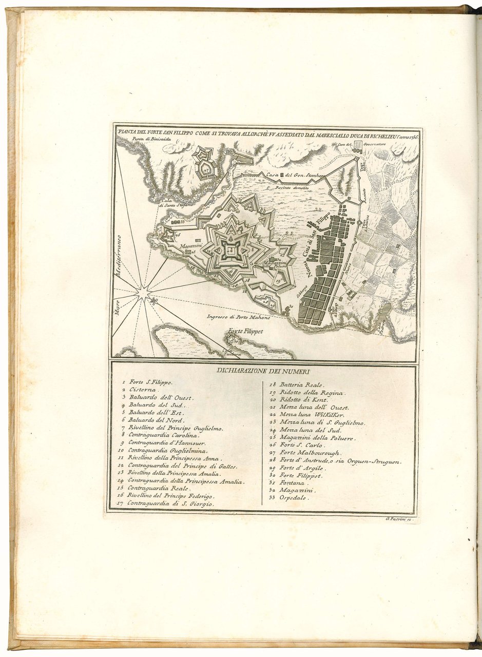 EDIZIONE ORIGINALE di questa sontuosa pubblicazione che celebra la presa di Port Mahon a Minorca da parte dei Francesi. Il volume comprende: la Relazione della resa del Forte S. Filippo, stampata su due colonne in italiano e latino; il poema latino composto dall'autore per l'occasione ad imitazione dell'Eneide ed accompagnato da ricche note storiche in italiano sull'isola di Minorca; il Corollarium al poema e i Parerga accompagnati da note in latino.