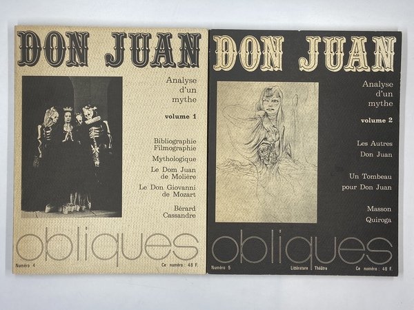 Due fascicoli della rivista, brossura, cm21x27, ciascun numero pp 160 illustrate in nero. Analisi del mito di don Giovanni in Moliere, Mozart, poi “les Autres Don Juan” in Baudelaire, Butor, Apollinaire, Byron, Martinon, Prieur, Merimee, Block, Puskin, Gautier, Lista, Trakl e altri, bibliografia, filmografia, scritti di Butor, Frisch, Ortega Y Gasset, Bataille e altri.