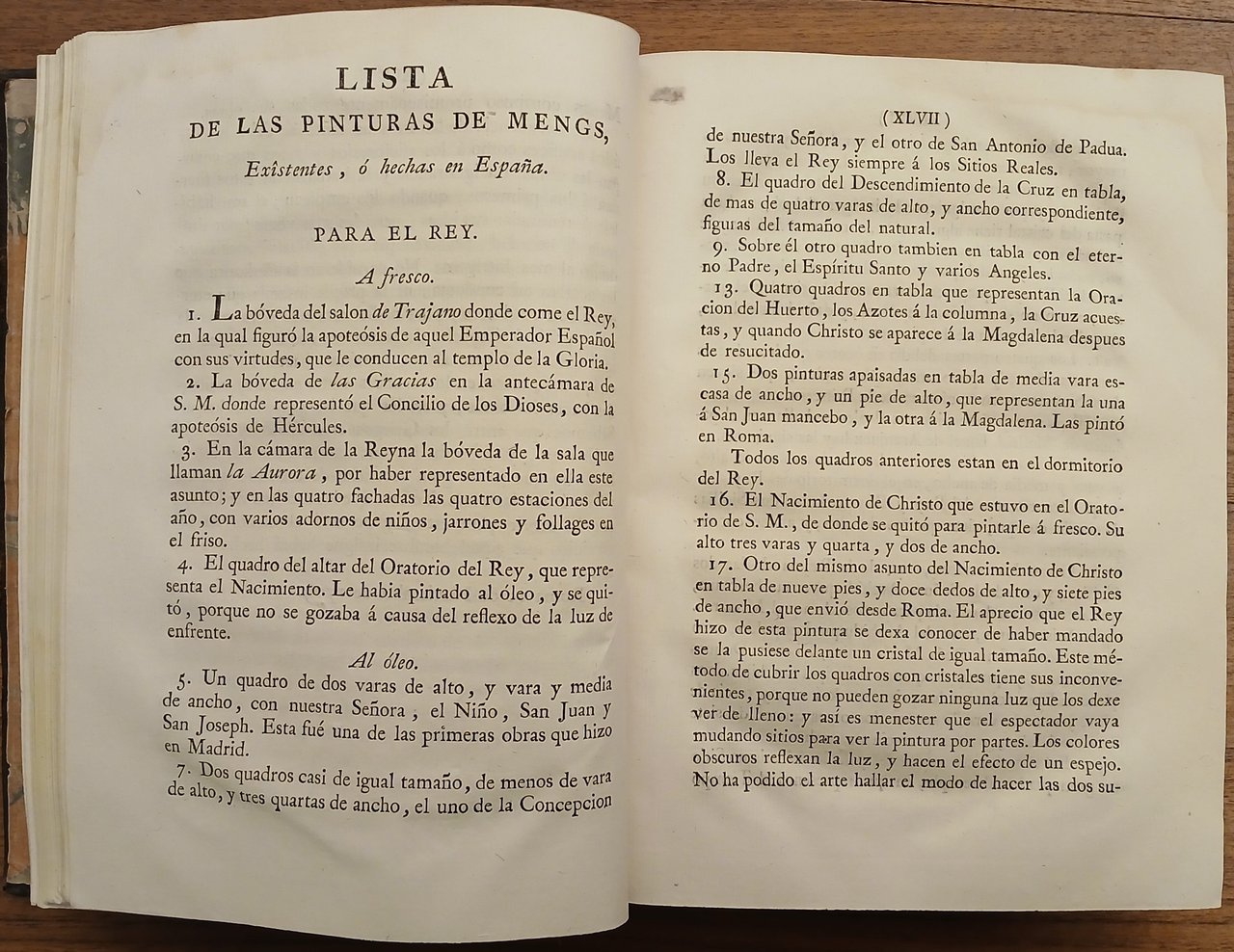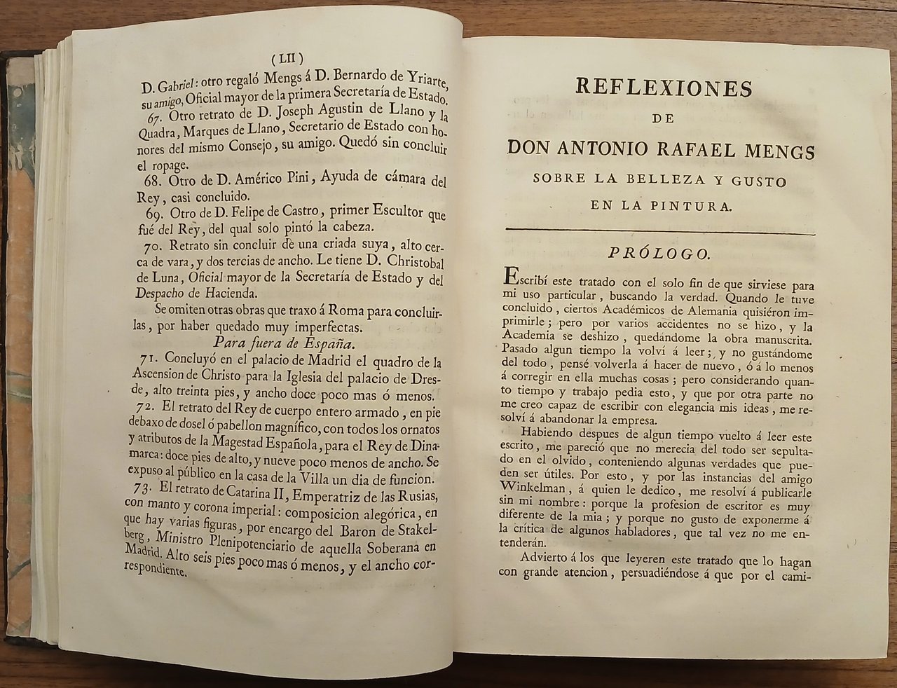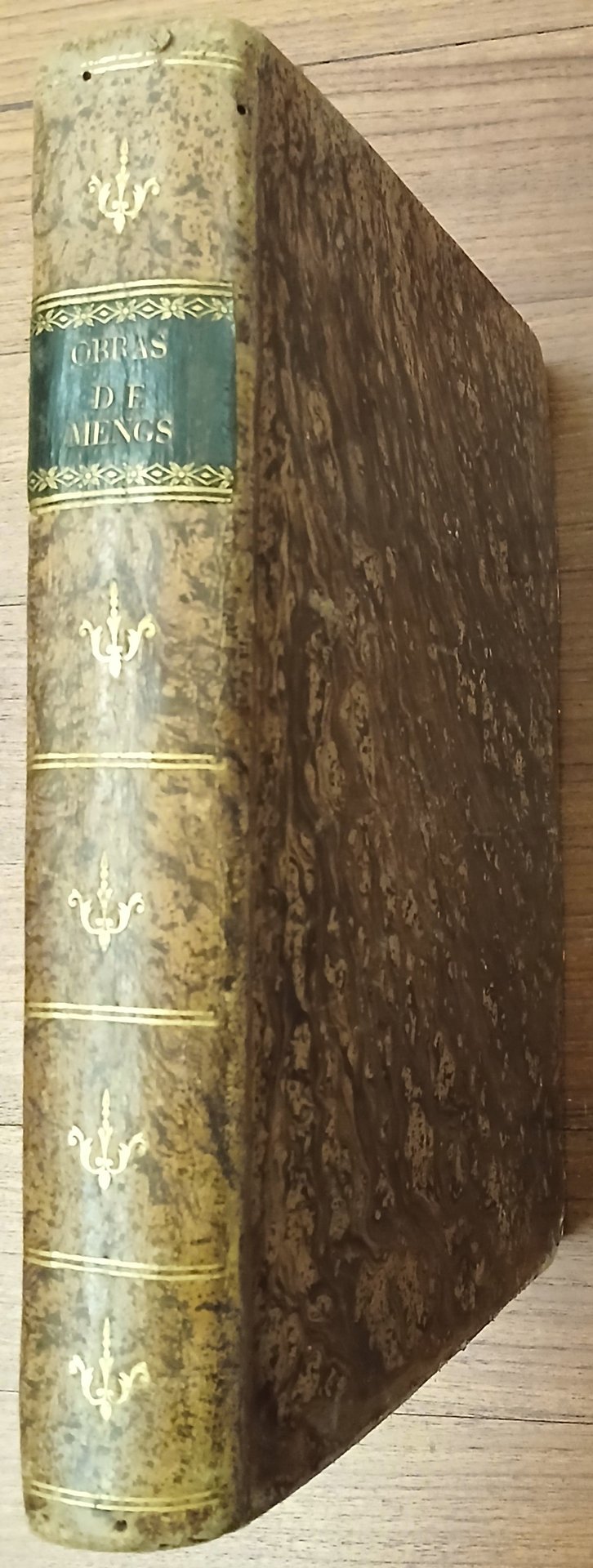 In 4° antico (cm 24 x 18,5), legatura coeva in piena pelle, titolo e fregi impressi in oro al dorso, carte di guardia marmorizzate, pp. (12),LII,402, con un ritratto di Mengs su tavola fuori testo. Leggera gora al margine di testa del ritratto e di alcune carte, peraltro ottimo stato di conservazione. Un errore, come in tutti gli esemplari dell'edizione, nella numerazione delle pagine : da pag. 324 si passa a pag, 327 ma il testo è completo.