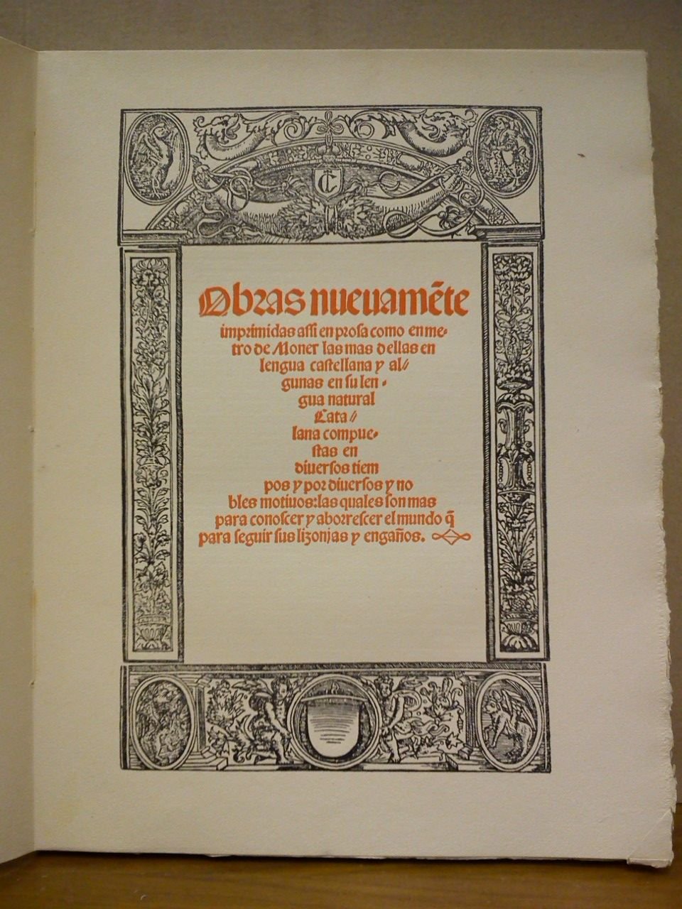 Obras nuevamente imprimidas assi en prosa como en metro de Moner las mas vellas en lengua castellana y algunas en su lengua natural Catalana compuestas en diversos tiempos y por diversos y nobles motivos: las quales son mas para conoscer y aborrescer el mundo que para seguir sus lizonjas y engaños