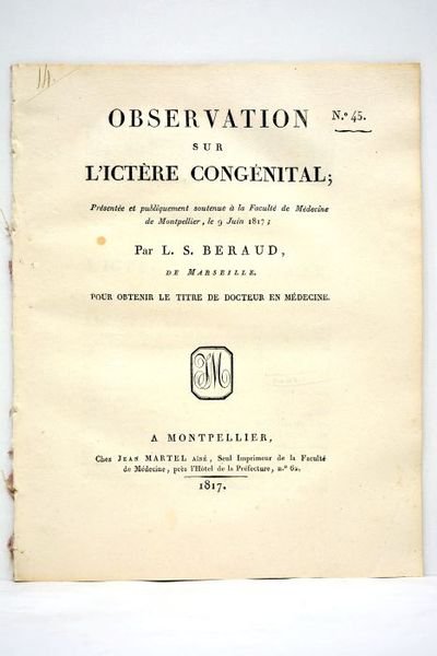 Observation sur l'ictère congénital. Présenté et publiquement soutenu à la Facutlé de Médecine de Montpellier, le 9 juin 1817.