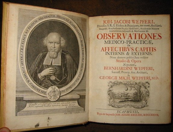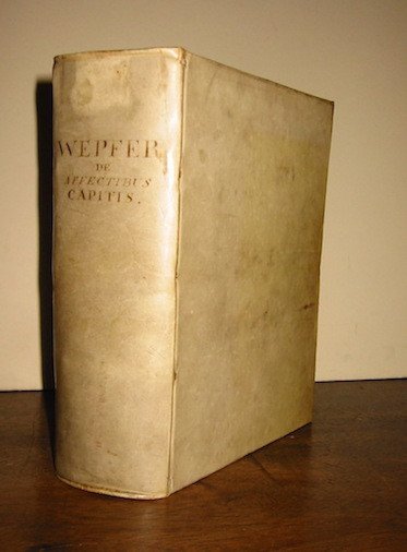 4to (cm. 20), 16 cc.nn. (compreso il ritratto dell’Autore in antiporta inciso su rame da Dieter Seiller ed un’illustrazione anatomica), 984 pp., 20 cc.nn. Frontespizio in rosso e nero con marca editoriale calcografica. Una testatina, culs-de-lampe e iniziali ornate xilografiche n.t. Legatura coeva in pergamena rigida con titolo ms. al ds. Tagli rossi. Esemplare in eccellente stato di conservazione. Prima rara edizione postuma di questa raccolta di osservazioni del celebre anatomista svizzero Wepfer (1620-1695). All’Autore si deve la scoperta delle ghiandole duodenali nonché numerose importanti ricerche sul sistema nervoso e l’apoplessia. Blake, p. 486; Walleriana, 10222.