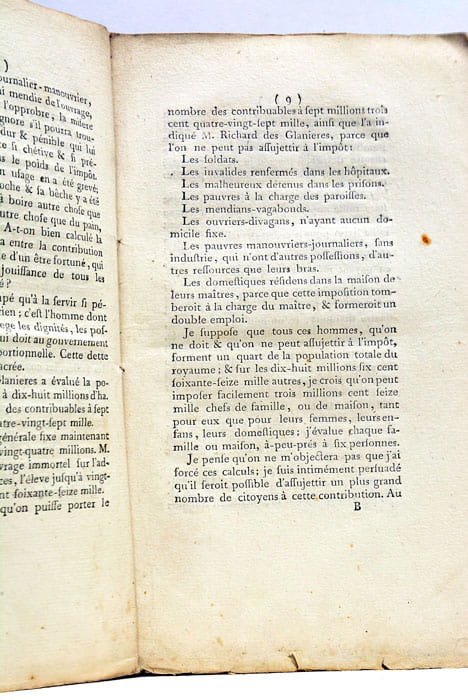 27 pages. (21,5x15 Cm). Broché en cahiers tel que paru. Projet destiné "au soulagement des pauvres." et contenant des réflexions envoyées aux Etats-Généraux. L'Auteur propose entre autres la suppression de l'impôt : "Ce malheureux journalier-manoeuvrier, couvert de haillons, qui mendie l'ouvrage, qui passe sa vie dans l'opprobe, la misère et l'incertitude. est accablé sous le poids de l'impôt. (.). A-t-on bien calculé la disproportion qu'il y a entre la contribution de ce misèrable et celle d'un fortuné, qui passe sa vie dans la jouissance de tous les avantages de la société ?". Traces de mouillures.