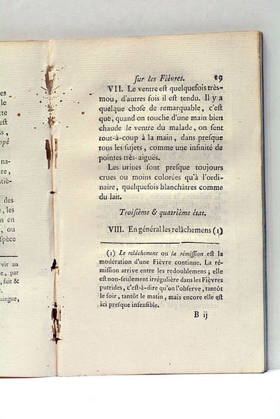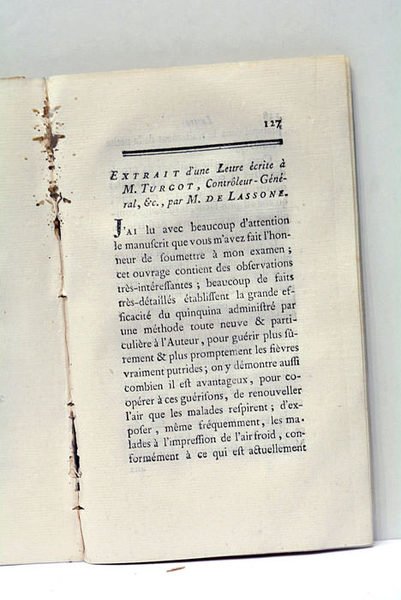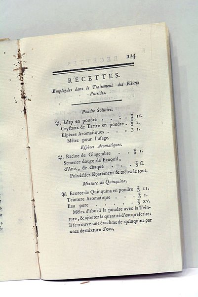 in-8. 136pp. Broché. Feuillets en partie déreliés. Trous de vers dans la marge intérieure, sans manque au texte. L'auteur étudie notamment les effets thérapeutiques du quinquina et du vin pour soigner ces fièvres. Un chapitre s'intitule aussi "des moyens employés par le Capitaine Cook pour conserver la santé des matelots".