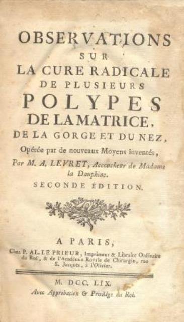 Seconde Édition, a Paris, chez P. Al. Le Prieur, Imprimeur & Libraire Ordinaire du Roi, & de l’Académie Royale de Chirurgie, rue S. Jacques, a l’Olivier, 1759, avec Approbation & Privilége du Roi. In 8vo, pp. XXXII, 479, (2 con il Privilege du Roy), (come note generali va segnalato che: la numeraz. delle pp. inizia in cifre romane e prosegue, da p. 33, in cifre arabe fino alla p. 36, poi ricomincia da p. 1, sempre in cifre arabe, e prosegue, fino alla fine, con le seguenti anomalie: p. 125 è num. come la 225; p. 395 è num. come la 495; p. 414 e 415 sono num. come la 416 e 417 che vengono poi ripetute corrett. al loro posto a seguire; p. 441 e 442 sono num. come la 401 e 402), front. con piccolo fregio tip., 6 tavv. f. t. incise in rame da T. Mutel e Scotin l’ainé su disegno dell’A., più volte rip., a carattere anatomico e strumentale, leg. in t. pelle di vitello con fregi e titolo in oro al dorso, dorso a 5 nervi, sguardie in carta col., tagli marmorizz. in blu. Raro e importante trattato sulla chirurgia dei polipi (della matrice, della gola e del naso) che merita attenzione per la chiara esposizione con cui affronta determinate patologie, comuni ma insistenti per quel tempo, con una particolare efficacia della descrizione dei vari modi di operare e della strumentazione esistente, sofisticatissima per l’epoca. Legatura con difetti al dorso e con usura della cuffia alla testa e al piede del dorso, lievi aloni di umido alle pagine con qualche traccia di sporco, minime presenze di tarlo al solo frontespizio e all'angolo inferiore bianco di poche carte, peraltro esemplare in buona impressione e completo delle tavole molto ben conservate.