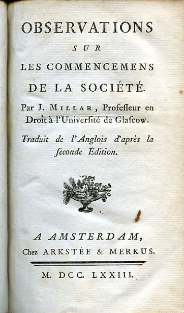 In-12° (169x102mm), pp. XXIV, 423, (2), legatura coeva p. vitello marmorizzato con titolo in oro su tassello rosso e fregi floreali e vegetali in oro su dorso a nervetti. Tagli rossi, sguardie marmorizzate. Piccola vignetta al titolo. Fresco esemplare. Prima edizione in lingua francese, assai rara, nella traduzione di Jean Baptiste Suard (1732-1817), delle 'Observations concerning the Distinction of Ranks in Society' (London, 1771), opera al confine tra la storia e il pensiero politico sull'evoluzione delle classi sociali e il loro incidere nel costituirsi delle società umane. Il libro è uno degli incunaboli del moderno determinismo economico e del materialismo storico di stampo marxiano, con la sua tesi per cui tutti i rapporti sociali, anche le relazioni tra i sessi, sono determinati dal sistema economico. L'autore discorre della condizione delle donne, della famiglia e del matrimonio in relazione alle varie società, degli effetti della ricchezza e dell'agricoltura, della giurisdizione paterna, delle tribù e delle autorità che le governano presso i popoli cosiddetti non civilizzati, dei poteri del sovrano, dello schiavismo, etc. Il Millar (Shotts, 1735-Glasgow, 1801), economista, giurista, filosofo e storico, fu professore di diritto civile all'Università di Glasgow e amico di David Hume, del cui pensiero egli profondamente risentì. Evidente, nelle sue opere, anche l'influsso delle dottrine economiche e sociali di Adam Smith. Cfr. Jean Mondot, Diderot, Raynal et les Lumières écossaises, In Lumières, 2004, n. 3, p. 57 (rileva l'influenza dell'opera del Millar su Diderot e Raynal nelle loro tesi in merito alla schiavitù). Conlon, Siècle des Lumières, 73:1070. Quérard, France Littéraire, VI, 131. IESS, X, 348-349. Cfr. (edizioni inglesi): Kress, 6805. Higgs, 5330. Goldsmiths', 10712.