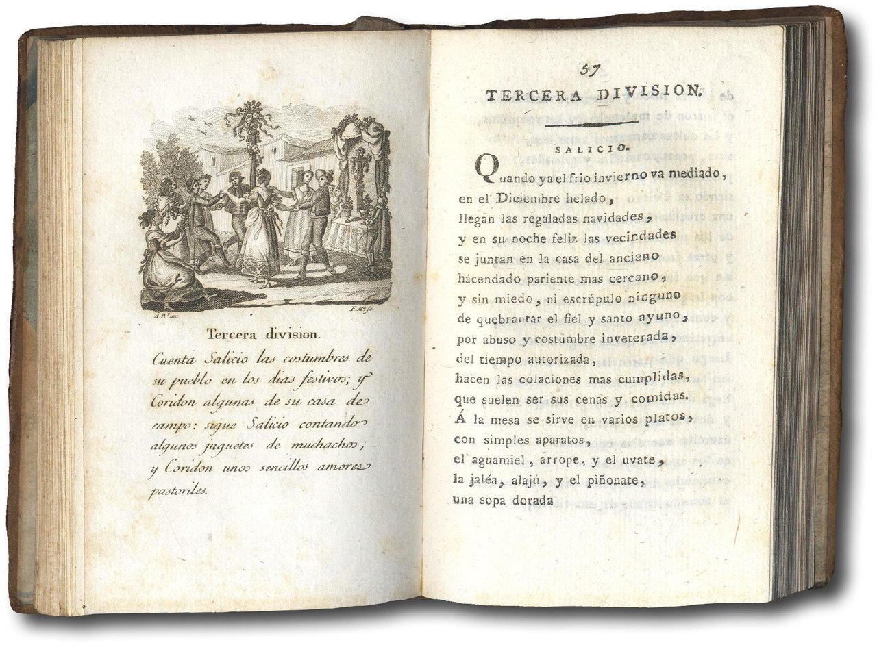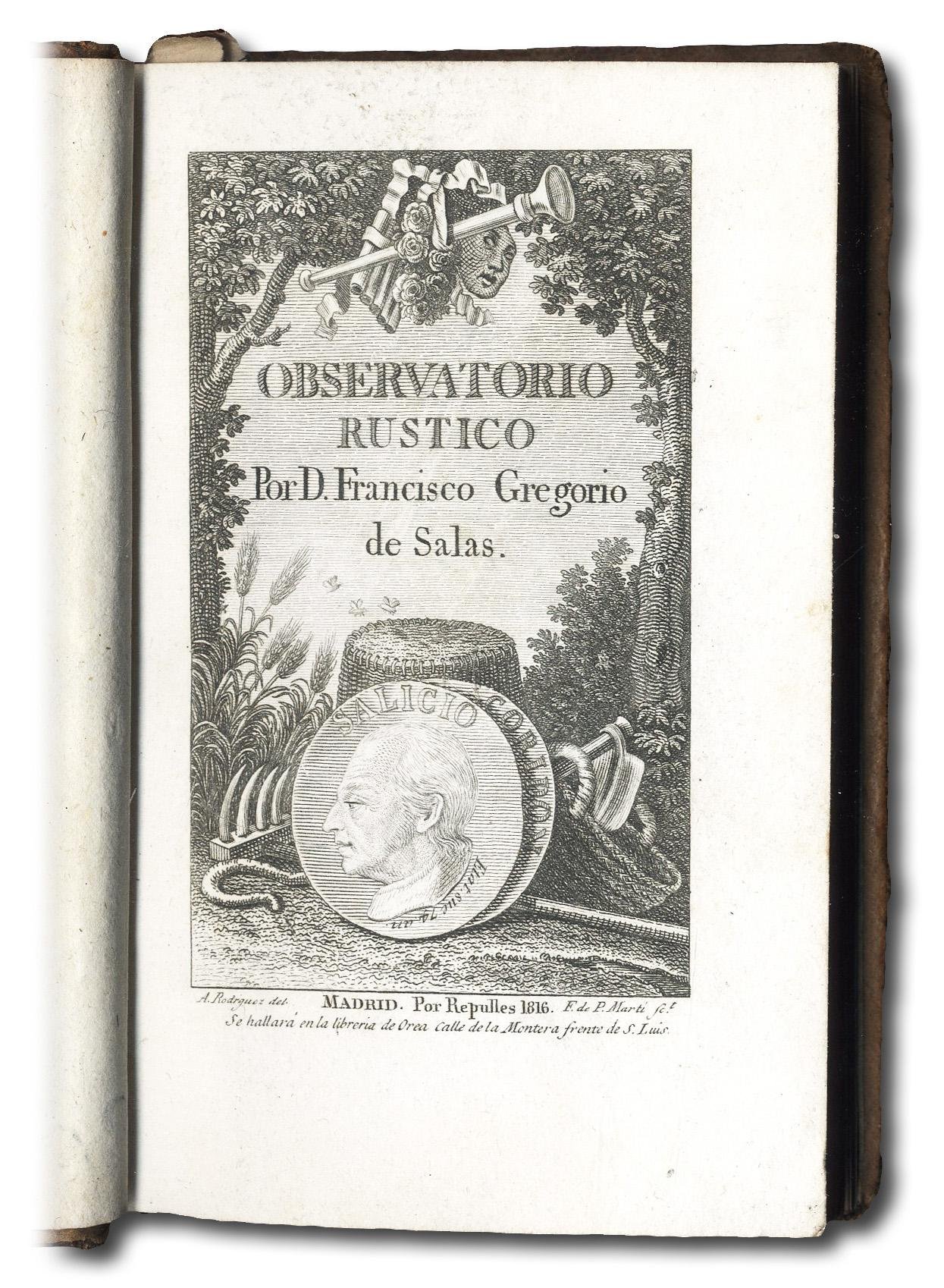 >in-12 (mm 140x90) pp. (4), 156, leg. p. pelle, titolo oro su tassello al dorso. Sei vignette in bianco e nero nel testo firmate F. Miranda fc., una per ciascun capitolo-division. Raccolta di componimenti campestri, che riflettono il grande amore del poeta per l'ambiente bucolico, tanto che furono composti in una capanna di campagna che l'A. fece appositamente costruire fuori Madrid, da cui non poteva allontarnarsi per gli impegni ecclesiastici, al fine di conversare con i pastori e osservare le loro abitudini. L'Observatorio rústico fu ristampato 10 volte tra il 1772 il 1830, l'autore, gesuita e poeta, fu assai apprezzato da Re Carlo IV e da Leandro Fernández Moratín, il più grande drammaturgo spagnolo del XVIII° secolo.