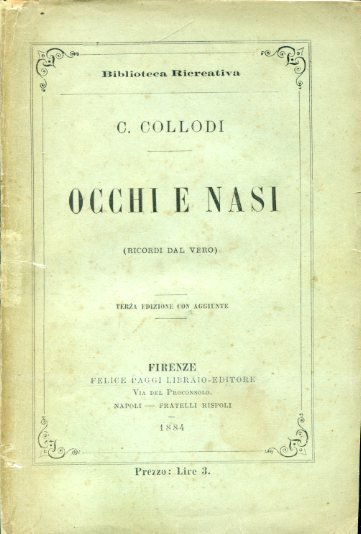 In-16° grande, pp. 221, brossura editoriale verde acqua con titolo entro filetti con fregi angolari. Dorso rifatto in carta consimile a quella dell'originale. Bell'esemplare. Terza edizione accresciuta (la prima è del 1881). In questi bozzetti e racconti collodiani rivivono uomini e cose di una Toscana e di una Firenze scomparse e già all'epoca in via di estinzione (un capitolo si intitola 'Gli ultimi Fiorentini'): le feste fiorentine, il palio dei cocchi e le corse dei fantini, i fiorentini al teatro, trattorie e osterie notturne, i caffè, il Caffè dell'Elvetichino, tipi fiorentini scomparsi, i fiaccherai, etc. 'L'ho chiamato così per fare intendere che non è una mostra di figure intere. È piuttosto una piccola raccolta d'occhi e di nasi, toccati in punta di penna e poi lasciati lì, senza finire'. Biblioteca Ricreativa.