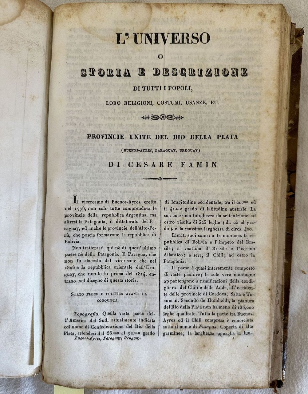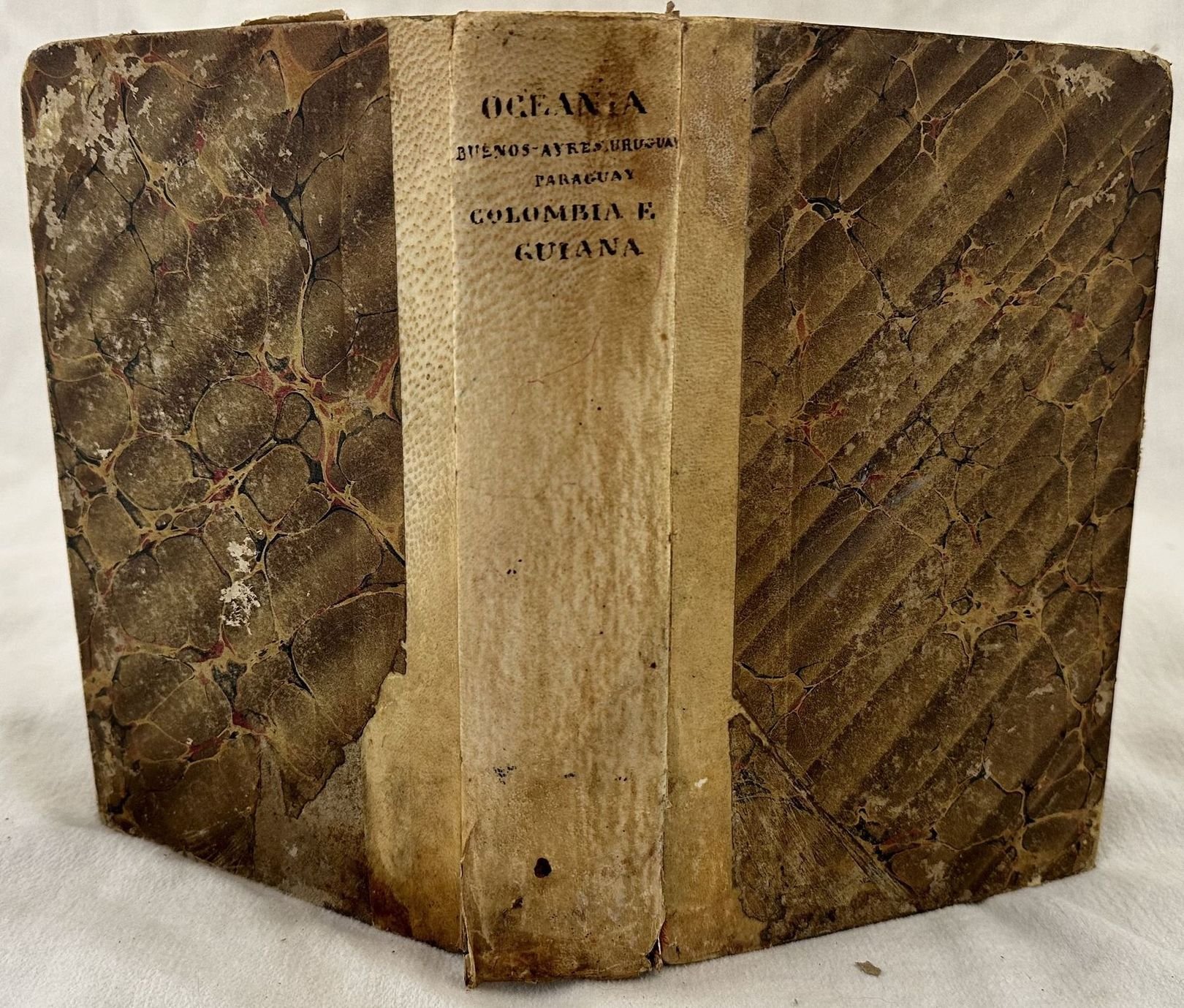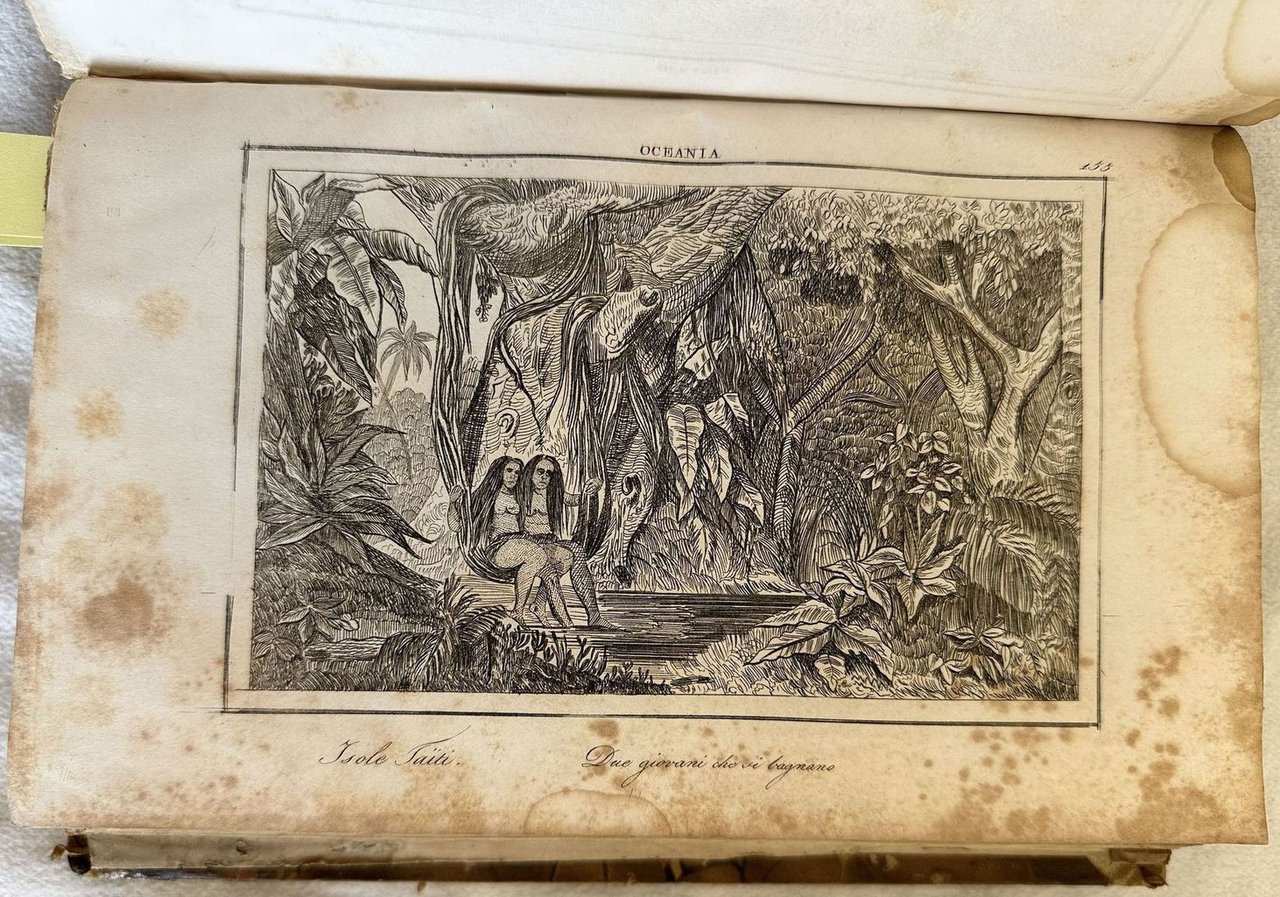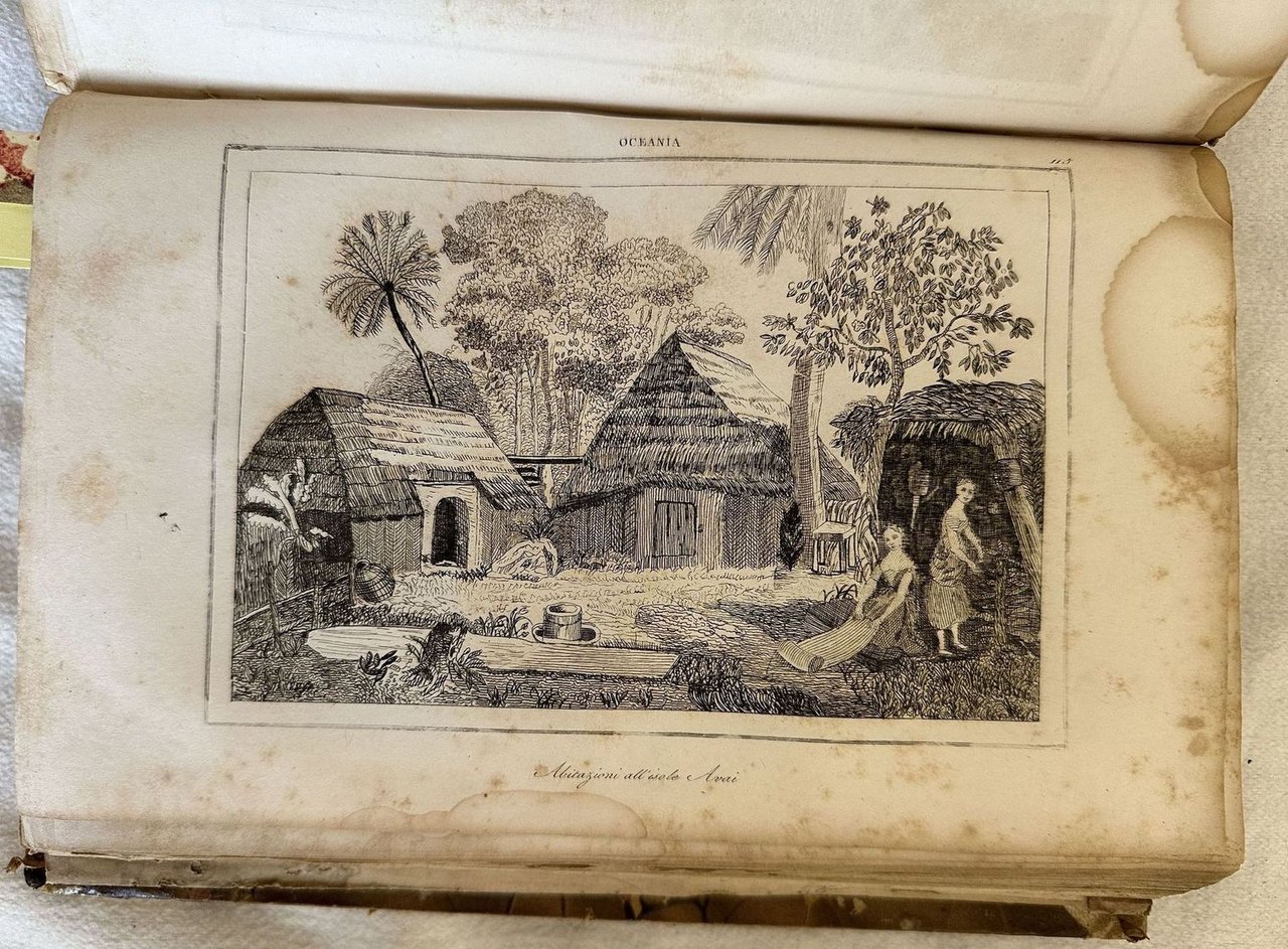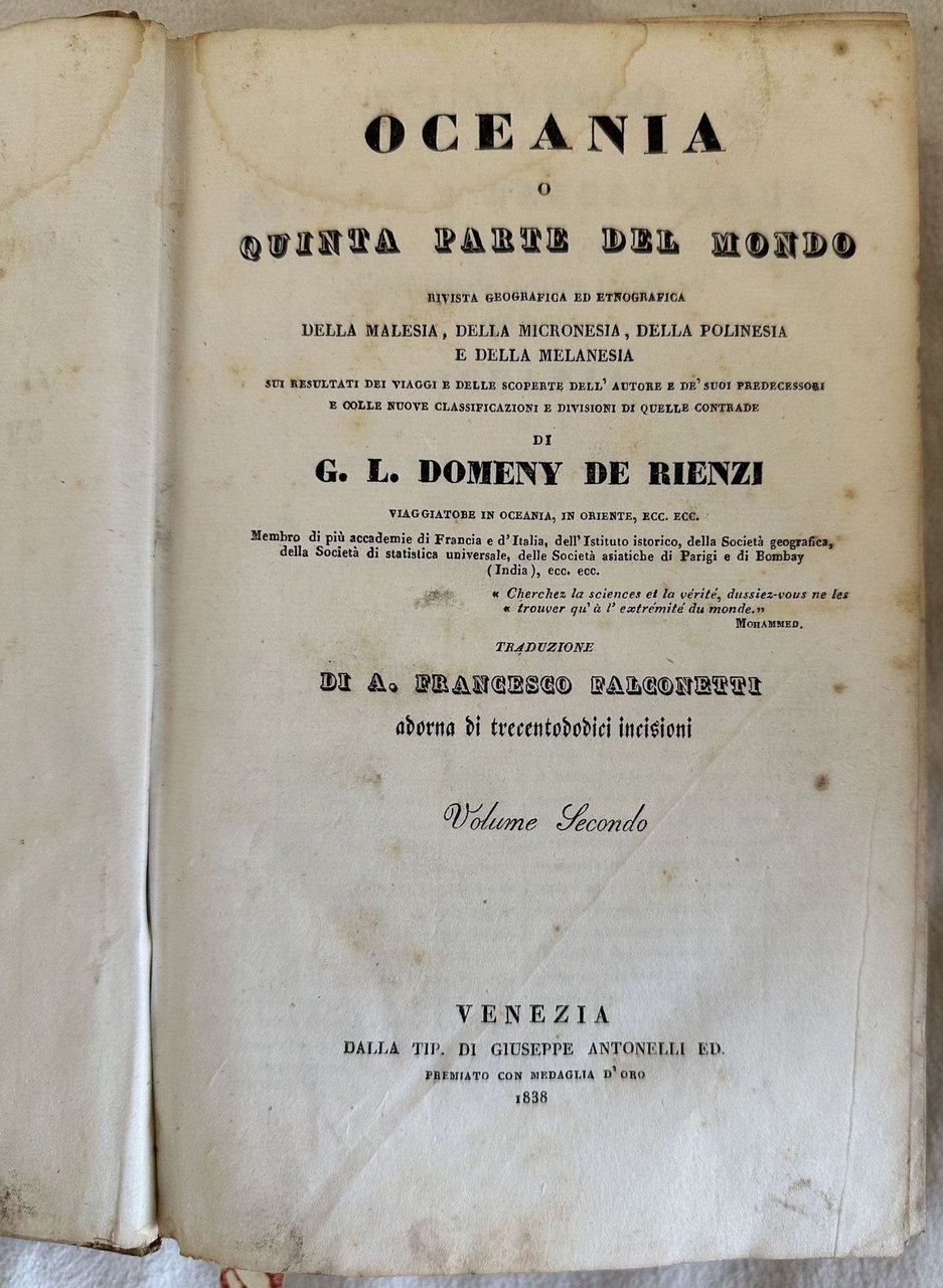Interessante volume del 1838 sull'Oceania scritto da Domeny de Rienzi. Traduzione a cura di Francesco Falconetti.Siamo in possesso del volume secondo (su tre) sull'Oceania (Isola di Tinian, Isole Sandwich, Colonie ed emporii inglesi, Tahiti. All'interno sono presenti 120 tavole fuori testo che rappresentano vedute, suppellettili, indigeni e una mappa ripiegata che rappresenta la Colombia e Guiana. In buone condizioni. Copertina in mezza pergamena con titolo manoscritto al dorso in buone condizioni generali con lievi usure ai margini e dorso. Legatura in buone condizioni. Pagine in buone condizioni con fioriture. Bruniture. In 8. cm 22,5x15. Pp. 411+96 pl.+63+16 pl.+1 mappa+32+8 pl.Interesting volume of 1838 about Oceania written by Domeny de Rienzi. Translation by Francesco Falconetti. We onyl have the second volume (on three) about Oceania (island of Tinian, Isole Sandwich, Colonie ed emporii inglesi, Tahiti). Inside there are 120 out of text plates representing views tools, local people and a folded map representing Colombia and Guiana. In good conditions. Half parchment cover with handwritten title in the spine in good conditions lightly worn in the extremities. Binding in good conditions. Pages in good conditions with foxing. Yellowing. In 8. cm 22,5x15. Pp. 411+96 pl.+63+16 pl.+1 mappa+32+8 pl.<BR><BR>