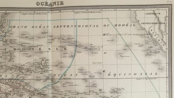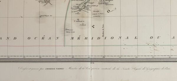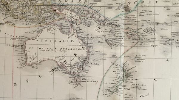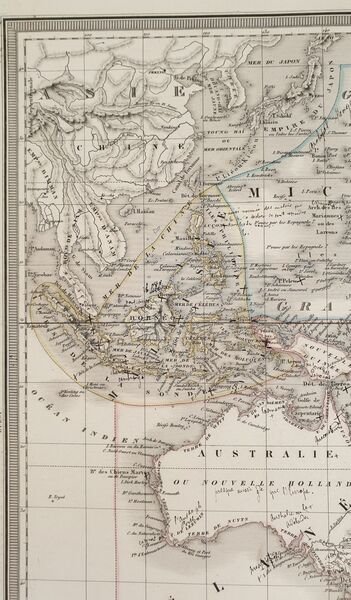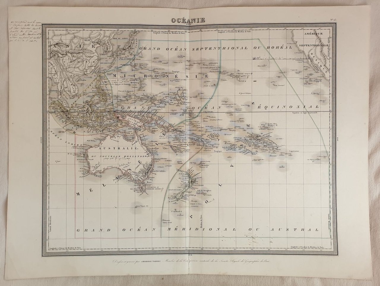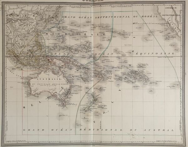 Mappa del 1870 circa colorata a mano dell'Oceania disegnata e incisa dal cartografo francese Ambroise Tardieu (1818-1879). Antica nota manoscritta. La mappa mostra l'Australia, Polinesia, Malanesia e Malesia. Autore: Ambroise Tardieu (1818-1879) Data: 1870 circa Tecnica: Incisione su rame colorata a mano Dimensione della pagina: 39x52 cm Dimensione dell'incisione: 33x34 cm Condizioni: Buone. Strappo al margine inferiore.Map of 1870 circa coloured by hand of Oceania drawn and engraved by the french cartographere Ambroise Tardieu (1818-1879). Antique handwritten note. The map shows Australia, Polynesia, Malanesia e Malaysia. Author: Ambroise Tardieu (1818-1879) Date: 1870 circa Technique: Copper etching coloured by hand Page Dimension: 39x52 cm Engraving Dimension: 33x34 cm Conditions: good conditions. Occasional foxings. tear in the lower edge.