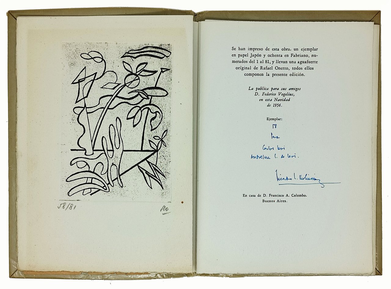 Buenos Aires, 1956; Edizione originale di una delle principali opere del poeta argentino Ricardo Molinari.; TIRATURA LIMITATA a 81 esemplari (esemplare numero 58).; Esemplare firmato e dedicato, a penna, dall'autore (autografato).; Con un'acquaforte originale di Rafael Onetto firmata e numerata a matita.; Rafael Onetto (1915- 1967) è stato un famoso artista argentino che espose in diverse Biennali d'arte tra cui, nel 1956, nella 28° Biennale di Venezia.; I fascicoli che compongono l'opera, nel classico stile delle edizioni originali, non sono rilegati tra di loro (ma si presentano sciolti). Pagine numerate: 15. Dimensioni: 18 x 26 cm circa.; Lingua del testo: spagnolo; Stato di conservazione: rari ed ordinari segni del tempo e dell'uso (qualche minuscola mancanza e taglietto sui margini della camicia editoriale, due o tre piccole macchioline gialle) ma, nel complesso, un esemplare decisamente buono.; Note: coperta flessibile con camicia editoriale (in carta velina).