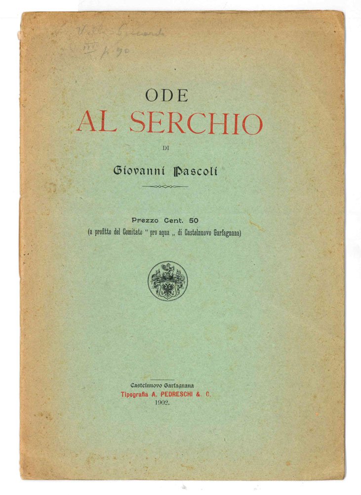 LIBROPrima edizione autonoma.Più che buon esemplare, scolorito sui bordi, nella variante con copertina in brossura verde (esiste in vari colori, da noi censiti anche beige e azzurro); principio di separazione a testa e piede del sottilissimo dorso muto, come normale.Edizione rara (solo tre localizzazioni ICCU), venduta «a profitto del Comitato ‘pro aqua’ di Castelnuovo Garfagnana». L’Ode fu pubblicata sul «Serchio» nello stesso 1902, qualche giorno dopo, sull'organo di informazione locale «La sementa»; la poesia fu riproposta nel presente fascicolo con alcune varianti e successivamente entrò a far parte della prima edizione di «Odi e inni» (1906) con una sola modifica al verso 24 («degli unici eroi» diverrà «dei ruvidi eroi»). La peculiarità di questa edizione, però, è costituita dalla lunga nota introduttiva dello stesso Pascoli – assente nelle altre edizioni –, che si apre con una citazione da «Inferno», XXX, vv. 63-5 «“Li ruscelletti che de’ verdi colli / del Casentin discendon giuso in Arno / facendo i lor canali e freddi e molli”, dove sono?» e si chiude con la data «Dal Ponte di Campia, Aprile 1902».Scheda sull’Archivio Giovanni Pascoli, online; Gambetti - Vezzosi, «Rarità bibliografiche», p. 643.