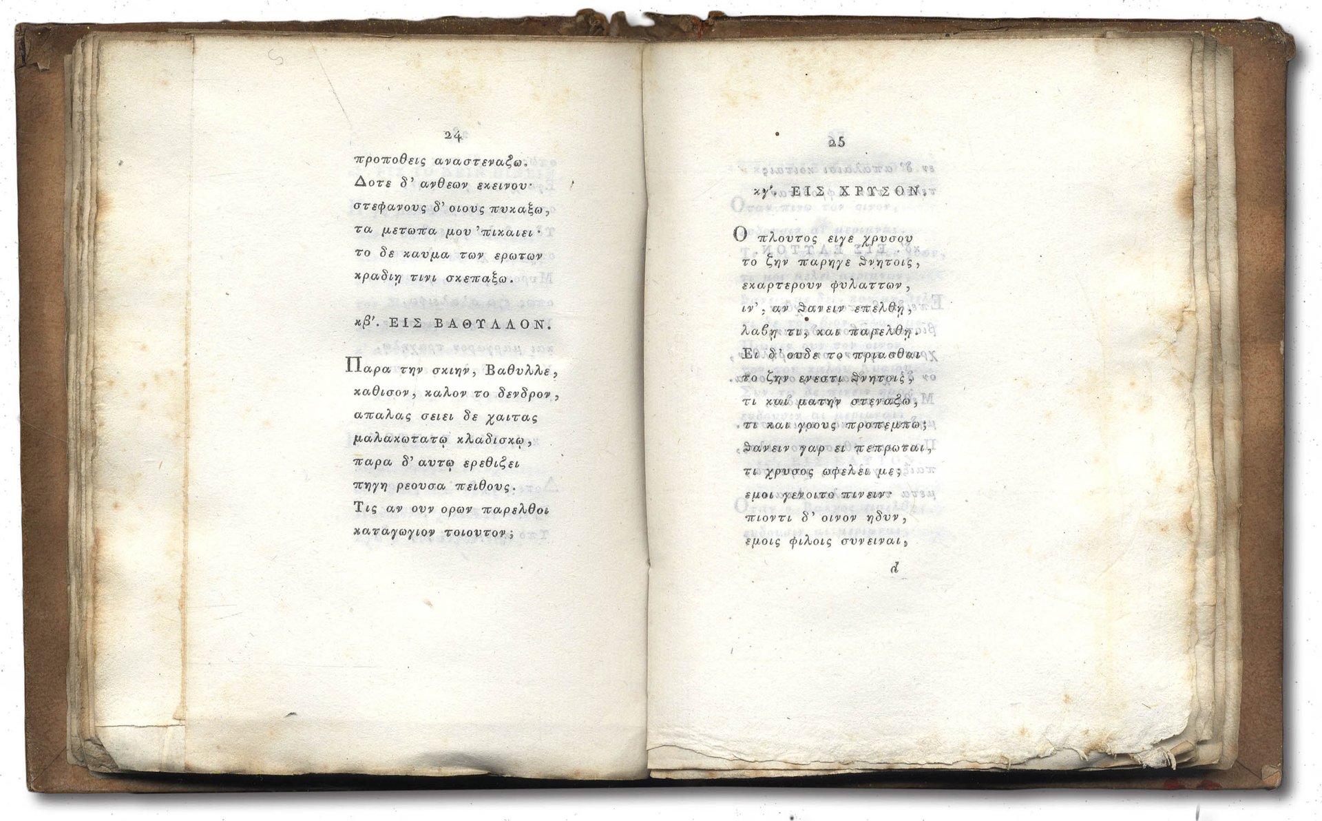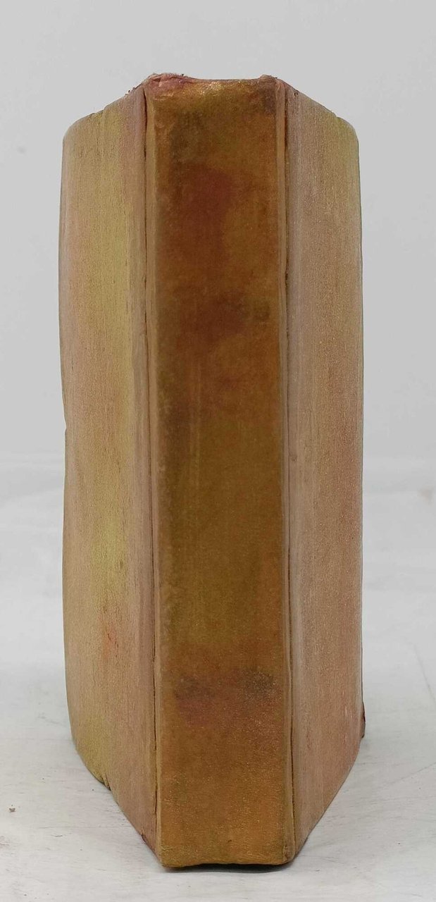>in-16 ducale, (120x93 mm), pp. (4), 120; 123, (1 f. bianco), legatura editoriale in cartone arancione, dorso abilmente restaurato. Ritratto di Anacreonte in medaglione al titolo, altro di Gius. Nic. de Azara, cui l'opera è dedicata, sul secondo f. I ''Commentarii'' in latino, secondo quanto afferma il De Lama, sono del Padre Paolo M. Paciaudi; le Odi in car. greco, a pag. 79 inizia la ''varietas lectionis''. Nello stesso anno Bodoni stampò le Odi di Anacreonte in una versione in-8vo, molto meno rara, e la presente in-16 che il de Lama definisce ''leggiadra edizioncella'' e il Renouard ''Bijou typographique et l'une des plus jolies éditions de Bodoni''. Tra le più eleganti e rigorose edizioni del Bodoni, grazie alla raffinata impaginazione: il minuscolo carattere greco e la stretta giustificazione vengono esaltate dai grandi margini immacolati. Delizioso esemplare, a fogli chiusi. Al verso dell'ultimo f. bianco nota di possesso ''Fr. Colondre Nov. 1810''. De Lama II, p. 54. Brooks 421. G.B. Bodoni nell'Europa neoclassica, Parma 1990, n. 30.