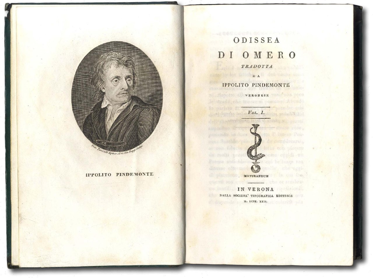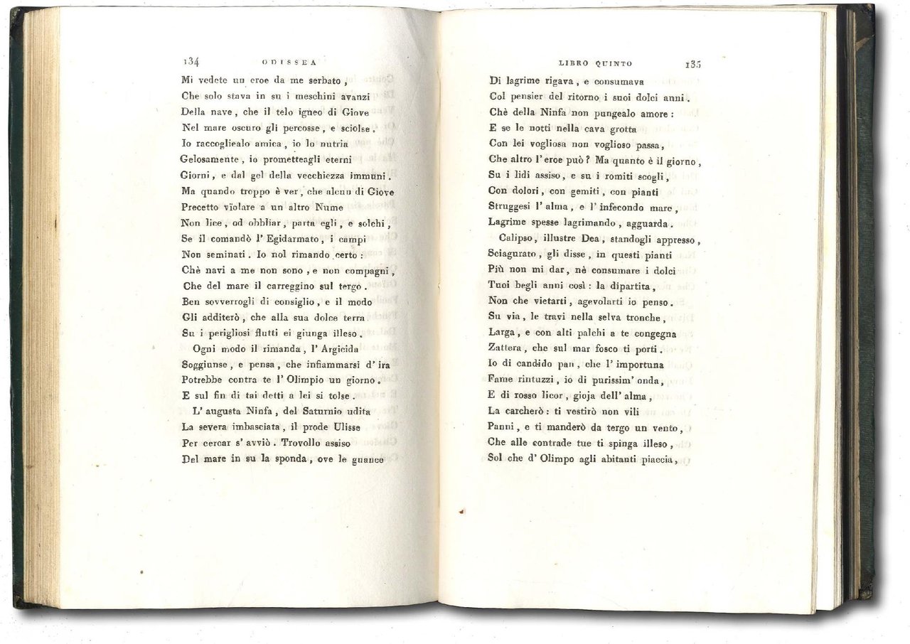 >2 tomi in un vol. in-8, pp. VI, (2), 360; 330; ottima legatura del tempo m. marocchinoo verde, dorsi con titolo e fregi oro. Ritratto di Pindemonte in ovale inc. in rame da Gio. Boggi, in antiporta al primo vol. Edizione originale, rara, di questa fondamentale traduzione, celebrata dai letterati, diffusissima ed ancor oggi insuperata. Perfetto esemplare, grande di margini. Gamba, Testi di Lingua, 2630. Parenti, prime edizioni. 404.