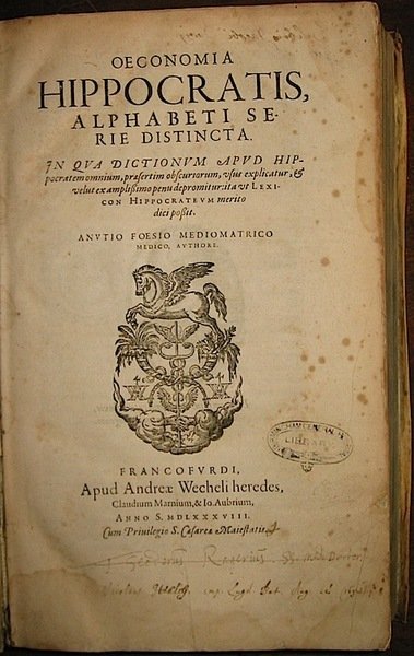 Oeconomia Hippocratis, alphabeti serie distincta. In qua dictionum apud Hippocratem omnium, praesertim obscuriorum, usus explicatur & velut ex amplissimo penu depromitur: ita ut Lexicon Hippocrateum merito dici possit
