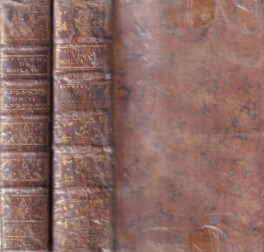 "Avec des Eclaircissements Historiques donnés par lui meme, & rédigés par M. Brossette (.) avec des remarques & des dissertations critiques par M. de Saint-Marc. Nouvelle édition. Augmentée de plusieurs Remarques & de Pièces relatives aux Ouvrages de l'Auteur. Enrichie de Figures gravées d'après les desseins du fameux Picart le Romain" -- Edizione in francese pubblicata ad Amsterdam tra il 1772 e il 1775 / French language edition published in Amsterdam between 1772 and 1775 - Due volumi in uniforme legatura in pelle marrone, titoli e fregi in oro al dorso, cxvi-431 + 618 pagine. Ordinari segni del tempo, ma nel complesso esemplari ben tenuti per questa pregevole edizione d'antiquariato.