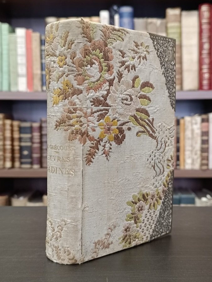 <span style="font-style: normal;"><span style="font-style: normal;">In-16° (cm. 18,8), graziosa legatura coeva in tutta tela floreale ricamata a colori e con cantonali metallici interamente composti da fregi di foglie e figurini agli angoli superiori (minimo difetto alla cerniera e lieve gora al solo piatto posteriore), taglio di testa dorato, </span><i>doublure</i> in tessuto azzurro decorato, unghiatura ornata con ricchi fregi in oro; pp. XV [1] 384 in ottimo stato (fioriture alla sola antiporta, leggera brunitura); con 1 frontespizio illustrato e inciso all'acquaforte da Félicien Rops&nbsp;all'antiporta fuori testo protetto da velina. Edizione impressa in 500 esemplari, il nostro è il n. 19. Fregio allegorico al frontespizio con titolo in rosso e nero, testatine, capilettera e finalini silografici. </span><i>Ex libris</i><span style="font-style: normal;"> applicato al verso del risguardo.&nbsp;</span>Esemplare molto buono. (L)