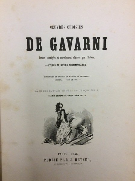 In-8 gr. (mm. 266x178), mz. pelle coeva, filetti e titolo oro al dorso. Il vol., suddiviso in 3 parti, contiene le seguenti serie, con complessive 211 (su 240) tavole umoristiche, inc. su legno da vari artisti, ciascuna con didascalia:1) "Fourberies de Femmes en matière de sentiment", pp. (8), con 48 tavole - "Clichy", pp. (4), con 19 tavole - "Paris le soir", pp. (4),con 13 tavole + pp. 2 di Indice.2) "Paris le matin", con 8 (su 10) tavole Mancano anche: frontesp. e testo - "Les etudiants", pp. (4), con 30 (su 47) tavole - "Le Carnaval à Paris", con 20 (su 23) tavole Mancano anche: frontesp., testo e Indice.3) "Les enfants terribles", pp. (8, 4) di prefazione e testo, con 39 tavole - "Traduction en langue vulgaire", (pp. 4), con 5 tavole - "Les lorettes", pp. (4), con 18 (su 25) tavole - "Les actrices", pp. (4), con 11 tavole + 2 pp. di Indice.Buon esemplare.
