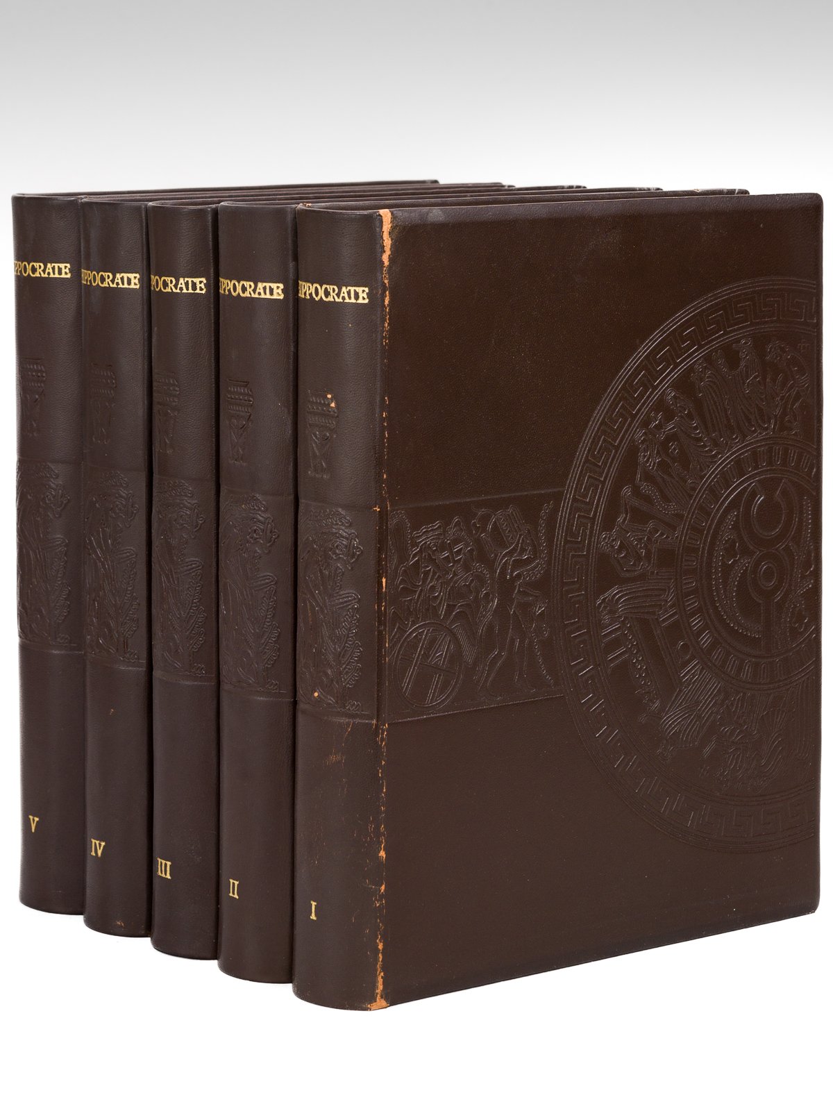 Un des 1200 exemplaires sur pur fil dame blanche numérotés de 801 à 2000 (n° 1318), introduction de Georges Duhamel, illustrations de Jean Chièze, édition revue et corrigée sur la traduction de Littré, reclassée selon un plan logique et suivie d'un glossaire, 5 vol. grand in-8 reliés pleine basane marron, Union Littéraire et artistique, Paris, 1955, 353 ; 370 ; 345 ; 354 ; 380 pp. Bon état pour cet exemplaire du second papier sur pur fil dame blanche (qq. petits frott. ou manques en dos et mors).