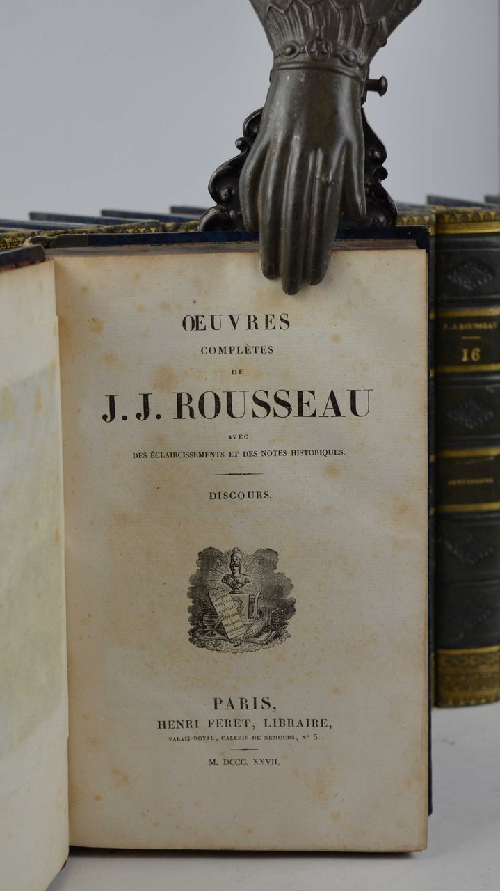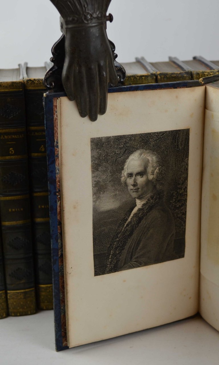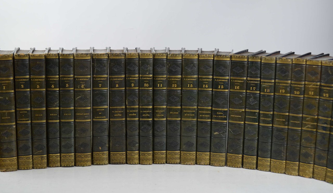 Ventisei volumi di cm. 20,5, pp. 13.000 circa complessive. Ritratto di Rousseau al primo volume e numerose tavole incise in rame fuori testo, ciascuna protetta da velina. Solida ed elegante legatura coeva in mezza pelle verde, dorsi lisci con filetti in oro, fregi a secco e titoli impressi. Firma di possesso alla prima carta bianca di ogni volume, qualche arrossatura sparsa, peraltro esemplare genuino e ben conservato, munito di una legatura perfettamente conservata ed assai decorativa. Edizione completa delle opere.