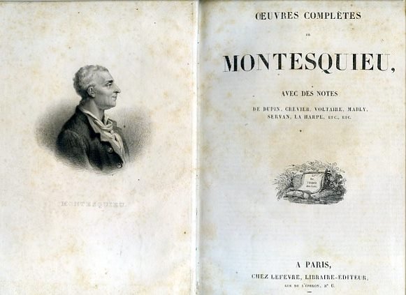 In-4°, pp. XXII, 771, legatura coeva m. pelle con punte in pergamena e piatti marmorizzati. Titolo, filetti e fregi dorati al dorso. Piatti marmorizzati. Ritratto di Montesquieu inciso su acciaio all'antiporta. Testo bicolonne. Rinfreschi al dorso. Buon esemplare. Edizione in un unico volume dell'opera omnia di Montesquieu. Contiene: Les Lettres Persanes - Considérations sur les causes de la grandeur des Romains et de leur décadence - L'Esprit des Lois - Défense de l'Esprit des Lois - Discours - Oeuvres diverses - Pensées diverses - Lettre familières.