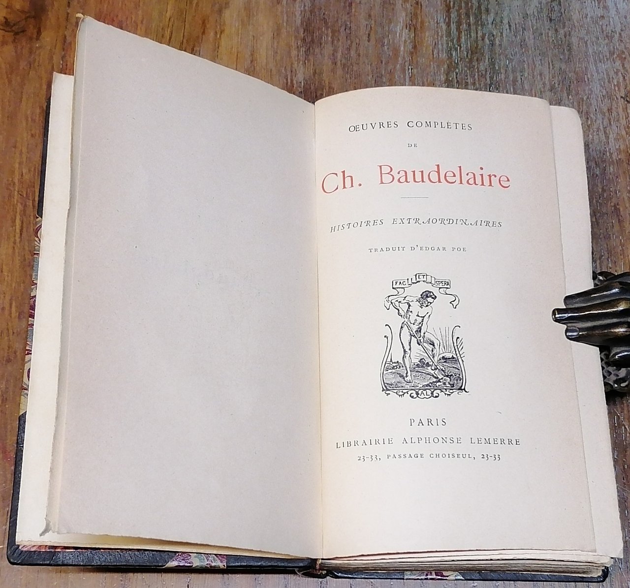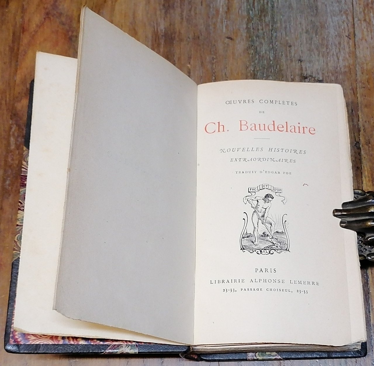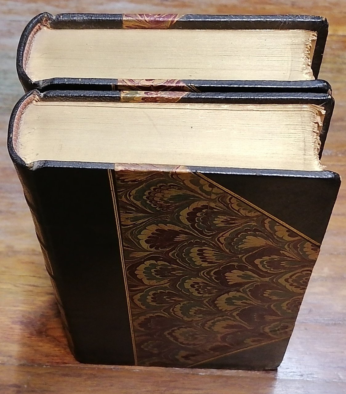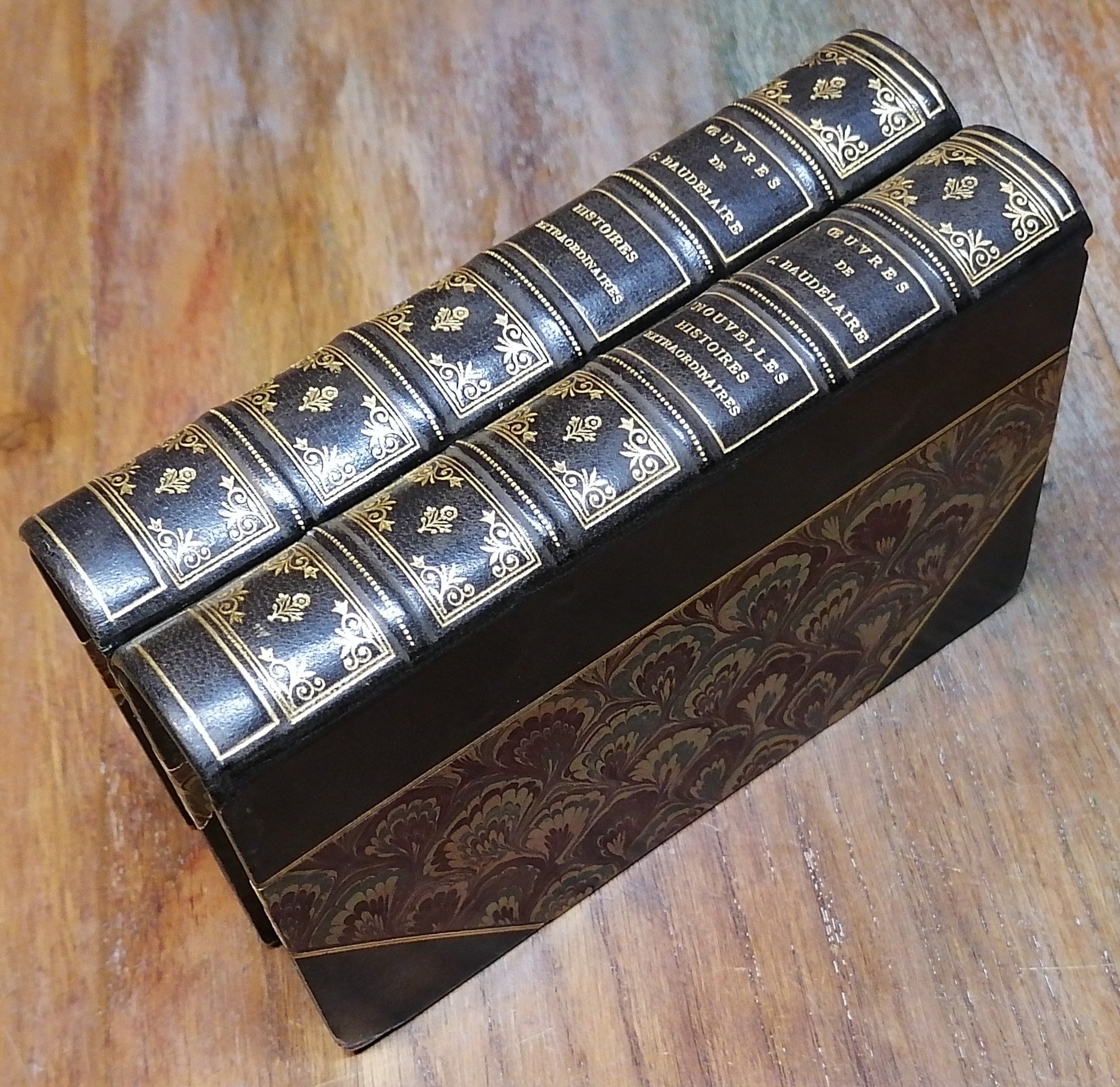 Due volumi in 16° (cm 16 x 9,5), legature in mezza pelle color testa di moro con ampie punte, ai dorsi titoli e ricche impressioni in oro, carta pavone policroma ai piatti e in diversa colorazione alle guardie, tagli di testa dorati, tagli davanti in barbe. "Histoires extraordinaires", pp. (6),480,(2), con testatine e finalini tipografici, precede i racconti il testo "Edgar Poe, sa vie et ses oeuvres" di Charles Baudelaire. "Nouvelles histoires extraordinaires", pp. (6),484,(2), con testatine e finalini tipografici, una prefazione di Charles Baudelaire "Notes nouvelles sur Edgar Poe". Collezione "Oeuvres complètes de Ch. Baudelaire". Entrambi i volumi in ottimo stato.