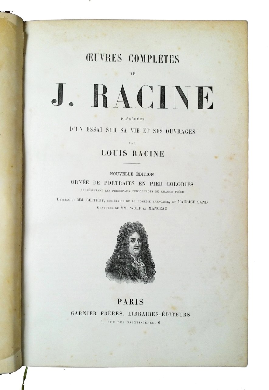 Oeuvres complètes de J. Racine, précédées d'un essai sur sa vie et ses ouvrages par Louis Racine. Nouvelle edition ornee de portraits en pied colories representant les principaux personnages de chaque piece. Dessins de MM. Geoffrey, societaire de la Comedie Francaise, et Maurice Sand. Gravures de MM. Wolf et Manceau.