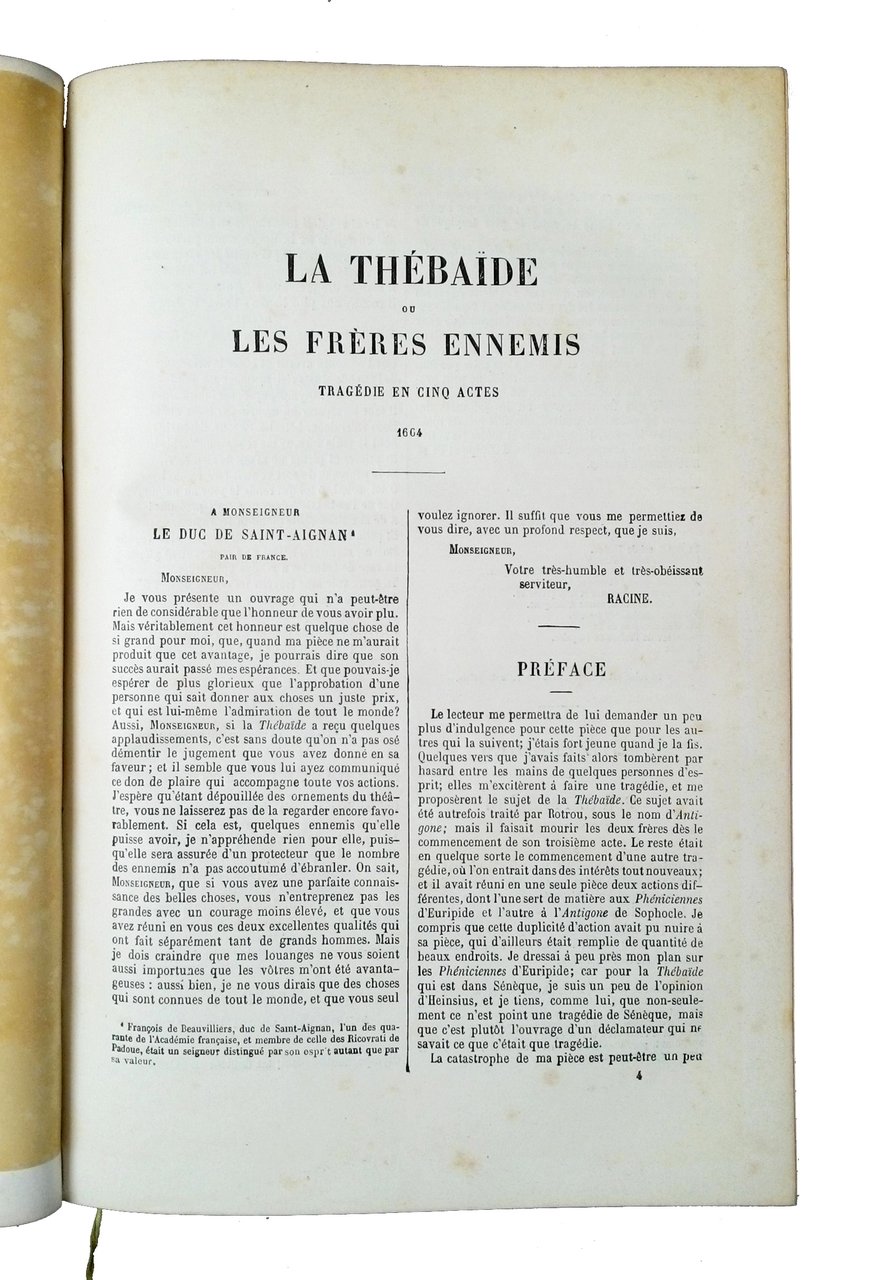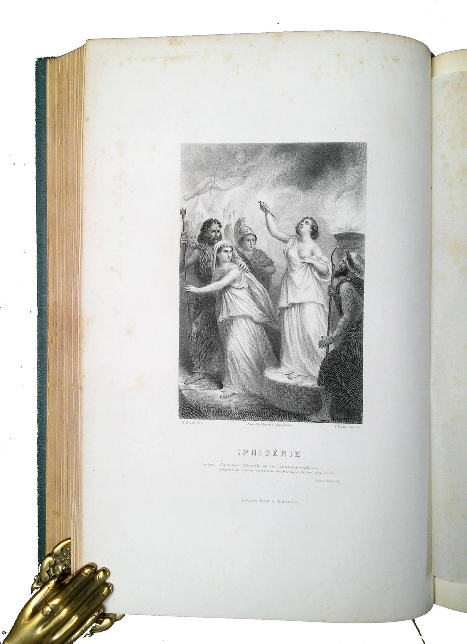 in-8° grande (cm 28 x 18,5); pp. 636; ritratto di Racine all'antiporta, 12 inc. in b/n su acciaio f.t. protette da velina (disegni di G. Staal e incisioni di F. Delannoy); leg. in mezza-pelle marrone scuro, dorso a cinque nervi, titoli e fregi in oro al dorso, piatti in percalina verde, carte di guardia marmorizzate, tagli dorati; testo su due colonne. L’anno di pubblicazione non è indicato, ma dovrebbe essere circa il 1860. Bella raccolta, a cura di Louis Racine (1692-1764), con le opere complete e cenni sulla vita del celebre tragediografo francese Jean-Baptiste Racine (1639-1699). Rif.: IT\ICCU\CAG\0061225. Cond.: qualche leggera fioritura; opera in condizioni generali molto buone. -- A BEAUTIFUL COLLECTION OF THE COMPLETE WORKS AND NOTES ON THE LIFE OF THE FAMOUS FRENCH DRAMATIST JEAN-BAPTISTE RACINE. Large 8vo (270x178 mm; contemporary half brown leather binding, five raised bands at spine, gilt title and decorations at spine, green percaline at boards, marbled paper at paste-downs and free-leaves, gilt edges; pp. 636; portrait of Racine at frontispiece, 12 steel engravings, protected by tissues (drawn by G. Staal and engraved by F. Delannoy); text in Fench, in two columns. Some light foxing; a very good copy. -- Demi veau et chagrin vert bouteille. Dos à nerfs, titre doré, deux plats décorés d'un encadrement à froid, tranches dorées. 1 portrait gravé en noir en frontispice, 12 gravures en noir hors-texte sur papier fort. Quelques rousseurs éparses, sinon exemplaire en bel état. Essai sur la vie et les ouvrages de Racine par Louis Racine. Oeuvres principales - Poésies diverses - Oeuvres diverses en prose - Fragments historiques - Discours - Lettres - Correspondance - Traductions - Pièces diverses. Texte sur deux colonnes.