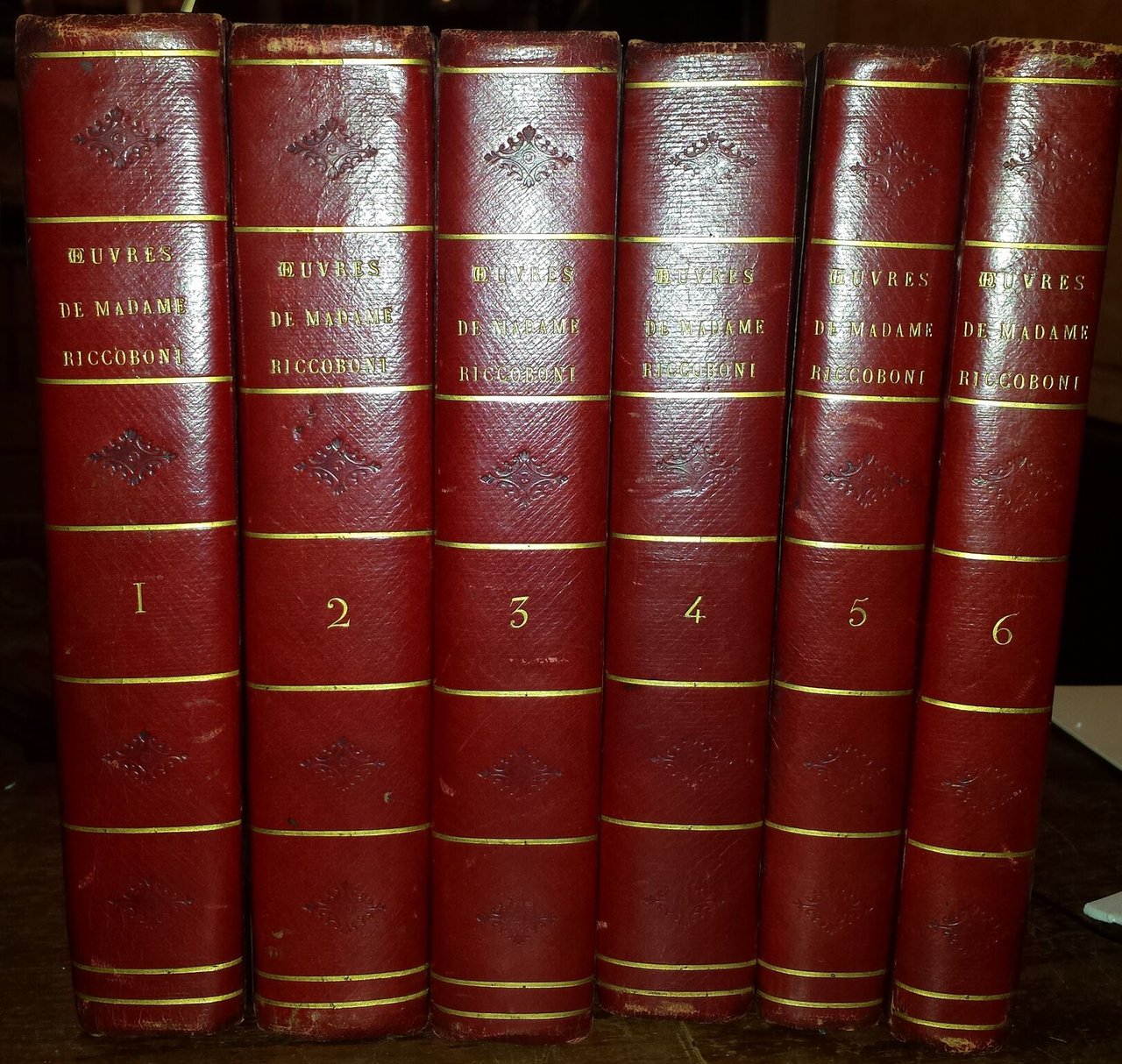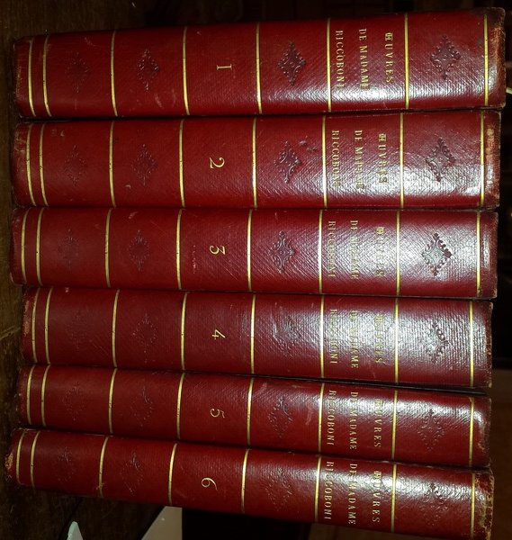 In-8 (21,5 cm) 6 voll. VI (1) c. (di tav. in antiporta) 570 (1) c. (di tav. uguale all'antiporta); (4) (1) c. (di tav. in antiporta) 562 (1) c. (di tav. uguale all'antiporta); (4) (1) c. (di tav. in antiporta) 487 (1) c. (di tav. uguale all'antiporta) (1); (4) 526; (1) c. (di tav. in antiporta) LVI VI (1) c. (di tav. uguale all'antiporta) 332; (4)LVI IV (1) c. (di tav. in antiporta) 570 (1) c. (di tav. uguale all'antiporta) 332; (4) (1) c. (di tav. in antiporta) 364 (1) c. (di tav. uguale all'antiporta). Mezza pelle rossa, piatti telati, caratteri dorati al dorso. Sono contenuti al primo volume: L'histoire du marquis de Cressy; L'histoire de miss Jenny; L'histoire d'Ernestine; La suite de Marianne. Le tavole contengono illustrazioni calcografiche disegnate da H. Pirau. Al secondo, Amelie; L'histoire de Christine de Suabe; L'histoire d'Aloise de Livarot; L'histoire d'Enguerrand; L'histoire des amours de Gertrude; L'histoire de deux jeunes amies e le tavole contengono illustrazioni calcografiche disegnate da Coquet e incisa da J. Adam e F. Manceau. Simonet Jean Baptiste Blaise (1742-1813); Pirau H; HPicou. Al terzo, Les lettres de miladi Juliette Catesby; Les lettres d'Elisabeth-Sophie de Valliere; La lettre de madame la marquise d'Artigues; L'abeille; L'aveugle; La suite de L'abeille; Les lettres de la princesse Zelmaide e le tavole contengono illustrazioni calcografiche disegnate da Coquet e incisa da F. Manceau. Al quarto, Les lettres de mistriss Fanni Butlerd; Les lettres d'Adelaide de Dammartin, comtesse de Sancerre; Les lettres de milord Rivers e le tavole contengono illustrazioni calcografiche disegnate da Coquet e incisa da E. Bovinet. Al quinto, The foundling ou L'enfant trouve comedie en cinqu actes par M. Edward Moore; The way to keep him ou La facon de le fixer comedie en cinq actes ecrite par M. Murphy; The deuce is in him ou Il est possede comedie en deux actes e le tavole contengono illustrazioni calcografiche disegnate da Coquet e incisa da F. Manceau. Al sesto, False delicacy ou La fausse delicatesse comedie en cinq actes par M. Hugh Kelly; The jealous wife ou La femme jaoluse comedie en cinq actes par George Colman; Les caquets comedie en trois actes et en prose e le tavole contengono illustrazioni calcografiche disegnate da Coquet e incisa da Tavernier. Le due tavole uguali del quarto volume sono contenute nel terzo. French language. Lingua francese