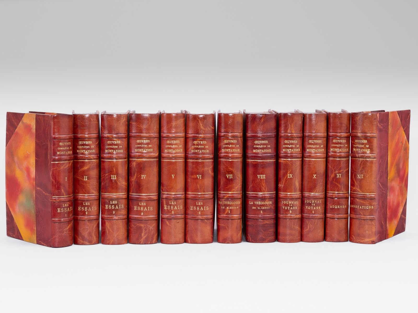 Oeuvres complètes de Michel de Montaigne (12 Tomes - Complet) Tomes I à VI : Les Essais ; Tomes VII et VIII : La Théologie Naturelle de Raymond Sebon ; Tomes IX et X : Journal de Voyage en Italie ; Tomes XI : Discours de la Servitude Volontaire. Lettres. Ephémérides. Notes Marginales ; Tome XII : Annotations sur les "Annales" de Nicole Gilles. Annotations sur le "Quinte-Curce" de Froben. Inscriptions de la "Librairie"
