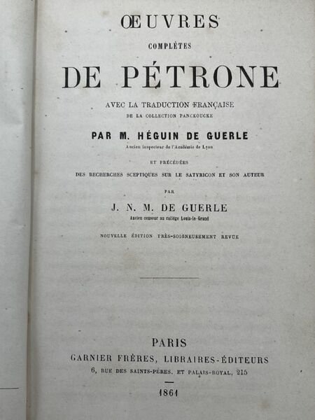 Paris Garnier 1861 Paris Garnier 1861, In-12 relié demi percaline bleue, xlv + 395 pages. Avec la traduction française de la collection Panckoucke par M. Héguin de Guerle et précédées des recherches sceptiques sur le Satyricon et son auteur par JN.M. de Guerle. Bon état.