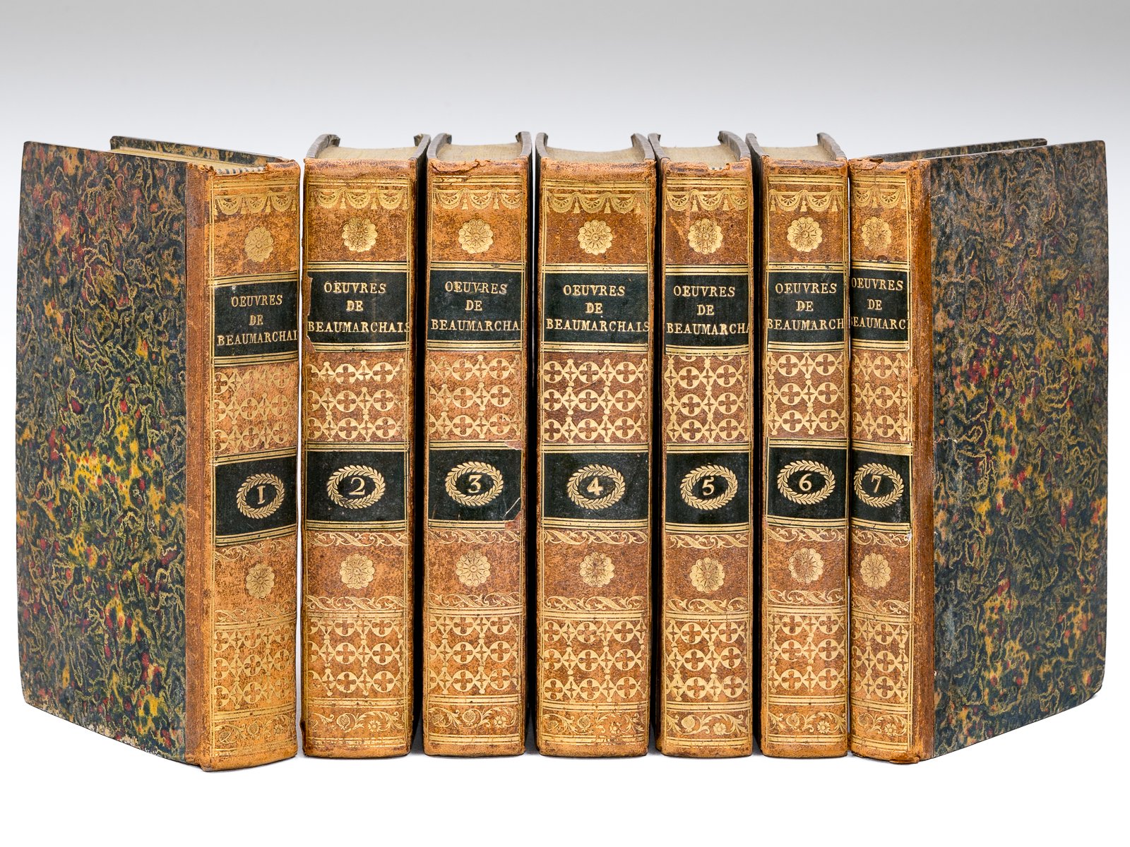 7 vol. in-8 reliure de l'époque demi-basane fauve, dos lisse orné, Chez Léopold Collin, Paris, 1809, avec frontispice et 14 planches hors texte au tome I, 11 planches hors texte au tome 2 Il s'agit de la première édition des "Oeuvres" de Beaumarchais, publiée sous la direction de Gudin, son ancien secrétaire. Etat très satisfaisant pour cet exemplaire décoratif et bien complet du frontispice et des 25 planches hors texte (petits mq. à 4 coiffes sup., petit trou à un planche, qq. traces d'usage, bon état par ailleurs). Brunet, I, 719