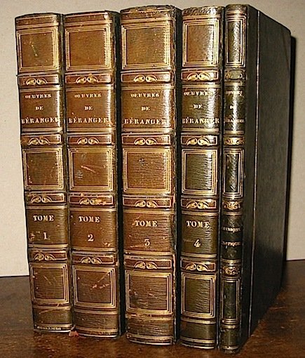 8vo (cm. 21), 5 Voll. con un ritratto in antiporta e 104 tavv. f.t. con vignette incise in acciaio (protette da velina). Ottime legature coeve (leggermente allentate quelle del primo e del terzo vol.) in mz. marocchino con angoli, nervi, fregi e titolo oro al ds. (Simier). Tagli marmorizzati come le carte di guardia. Arrossature sparse per la qualità della carta, ma ottimo esemplare completo della parte musicale e del Supplemento (Chansons érotiques). E ‘ la c.d. ‘Suite Johannot’, Cfr. Carteret pp. 74-80 e Vicaire, I, 409-410 (che descrive un esemplare che ha anche alcune carte non numerate [forse inserite in una successiva tiratura?] in cui sono elencate le tavole).