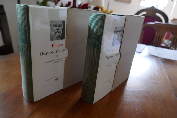 Ensemble de deux volumes de format in 12 de XX,-1380 et 1598 pp. sur papier "Bible". Reliure souple en plein cuir vert de l'Èditeur, dos dorÈ, titres dorÈs,en parfait Ètat. Traduction nouvelle et notes par LÈon Robin. tomde I : Hippias- Ion -Protagoras- L'apologie de Socrate -Criton- Alcibiade -Charmide- Laches- Lysis- Euthypheron- Gorgias- Menexene -Menon- Euthydeme -Cratyle- Le Banquet- Phedon- La Republique. tome II : PhËdre - ThÈÈtËte - ParmÈnide - Le sophiste - Le politique - TimÈe - Critias - PhilËbe - Les lois - Epinomis - Lettres apocryphes.