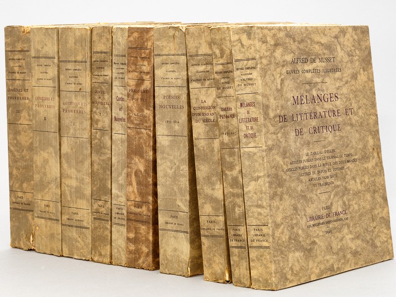 10 vol. in-8 br. couv. rempliées, ill. noir et blanc, Librairie de France, Paris, 1928 - 1929, 407 pp., 484 pp., 312 pp., 228 pp., 327 pp., 346 pp., 446 pp., 497 pp., 470 pp. et 265 pp. Oeuvres complètes illustrées : Premières poésies ( 1828 - 1833 ) ; Poésies nouvelles ( 1833 - 1852 ) ; Contes et Nouvelles I ; Contes et Nouvelles II ; Mélanges de litérature et de critique ; La confession d’un enfant du siècle - L’Anglais mangeur d’opium ; Comédies et proverbes I ; Comédies et proverbes II ; Comédies et proverbes III ; Correspondance ( 1827 - 1857 ) Etat très satisfaisant (qques petits accrocs sur jaquette, bon état par ailleurs). Poids total d’env. 10 KG. Prix pour l’ensemble.